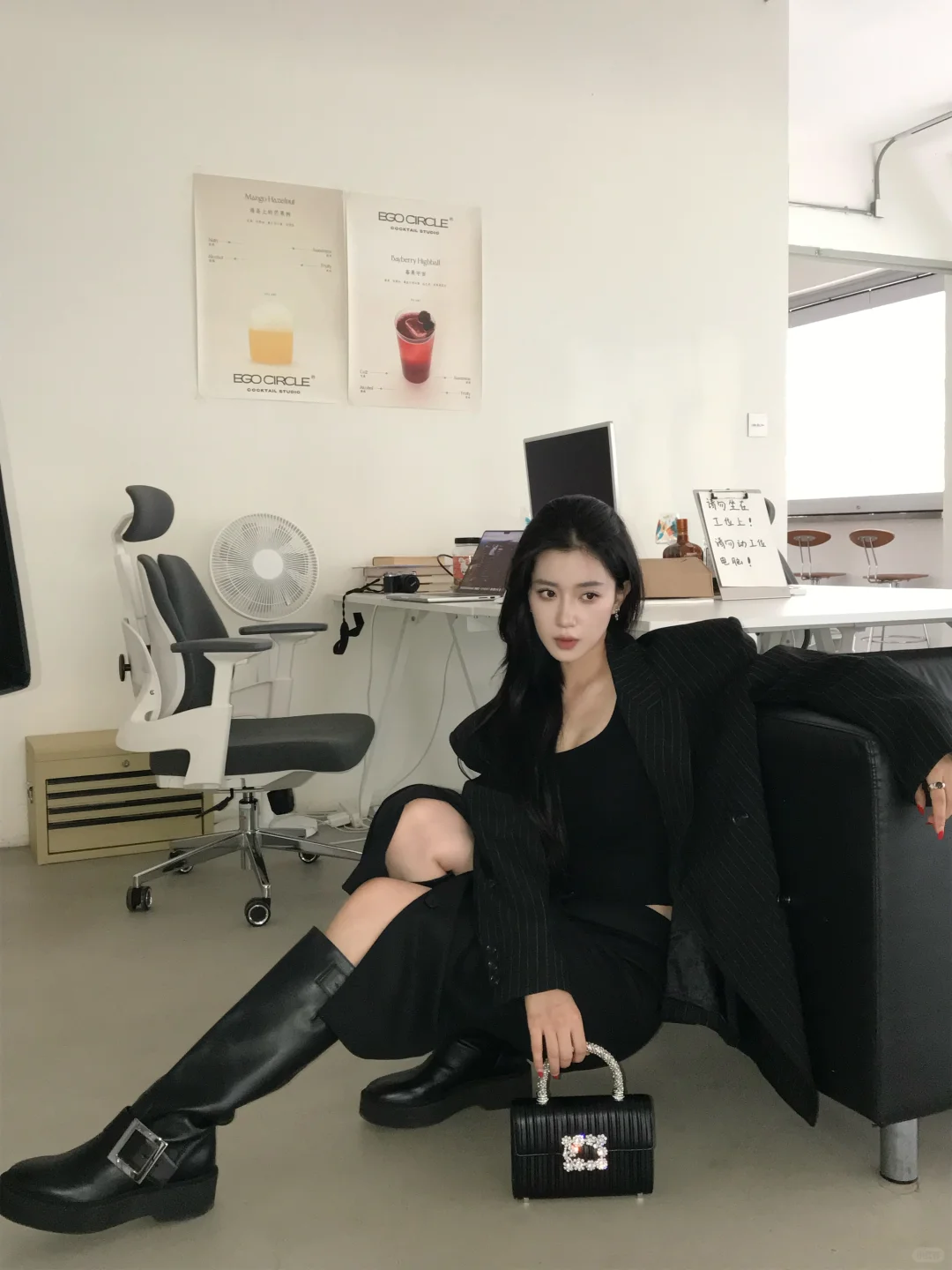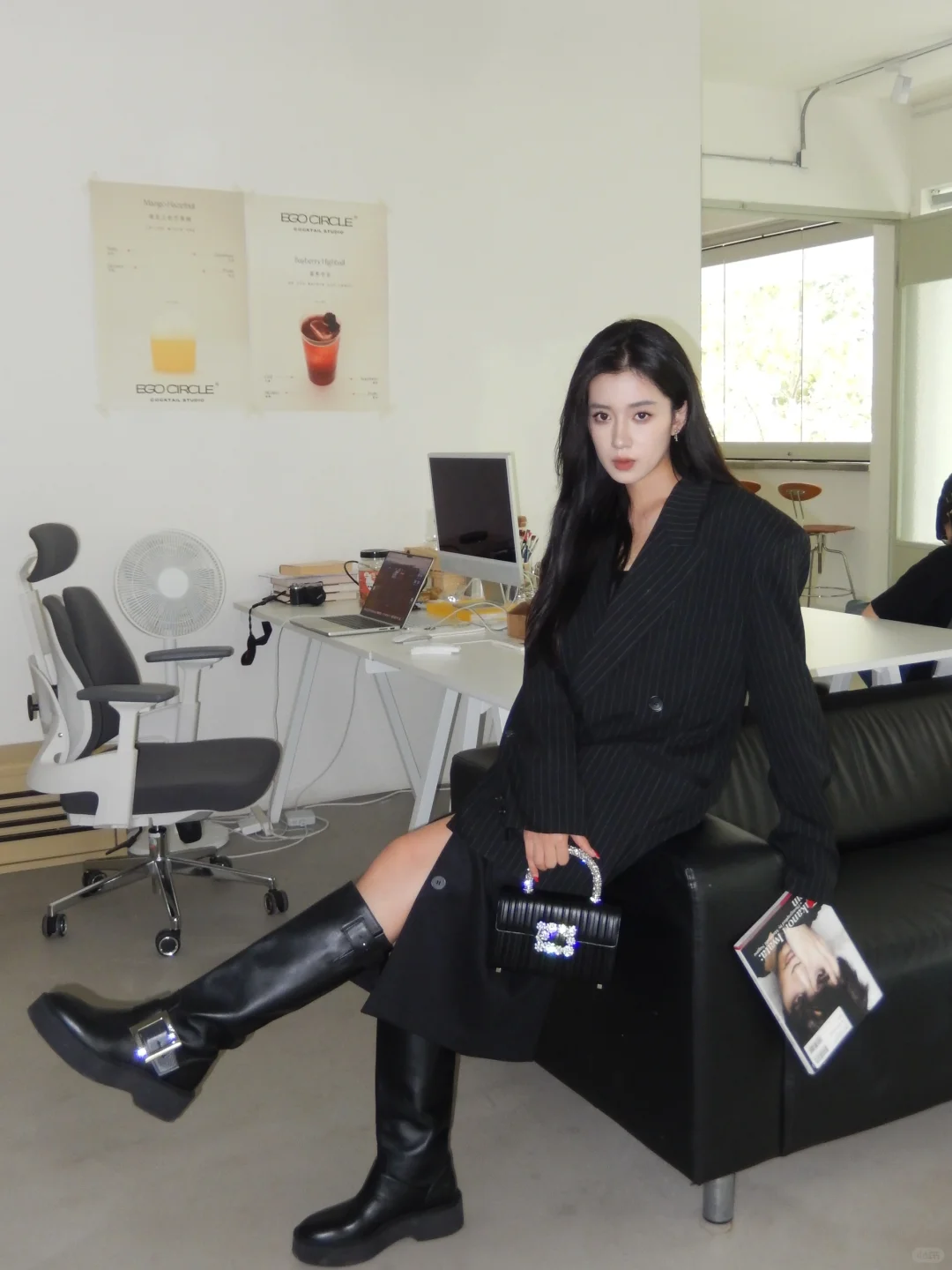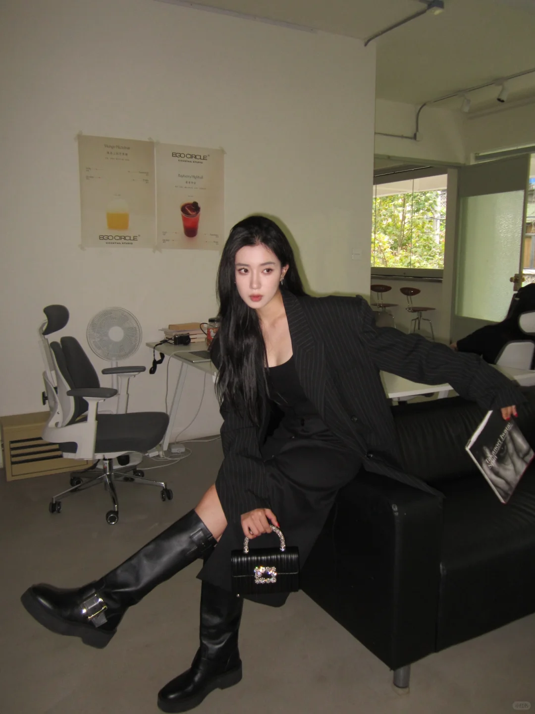 今天选择的风格依旧是我的舒适区 西装配长靴