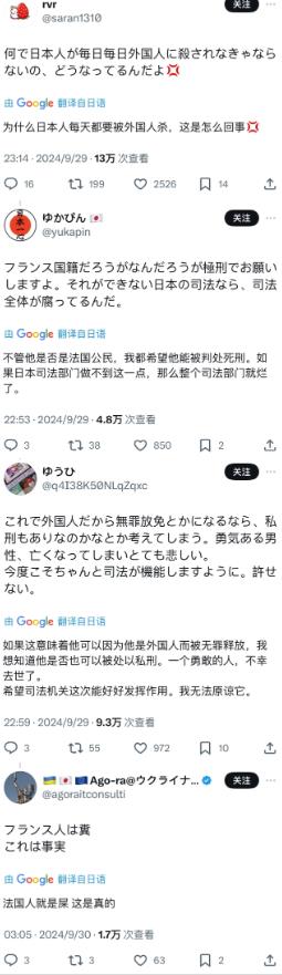 补充几句:日本网民表示:“为什么日本人每天都要被外国人杀,这是怎么回事”;“不管他是否是法国公民,我都希望他能被判处死刑。如果日本司法部门做不到这一点,那么整个司法部门就烂了”;“如果这意味着他可以因为他是外国人而被无罪释放,我想知道他是否也可以被处以私刑。一个勇敢的人,不幸去世了。希望司法机关这次能好好发挥作用。我无法原谅它。”;“法国人就是屎 这是真的”……(见图四)