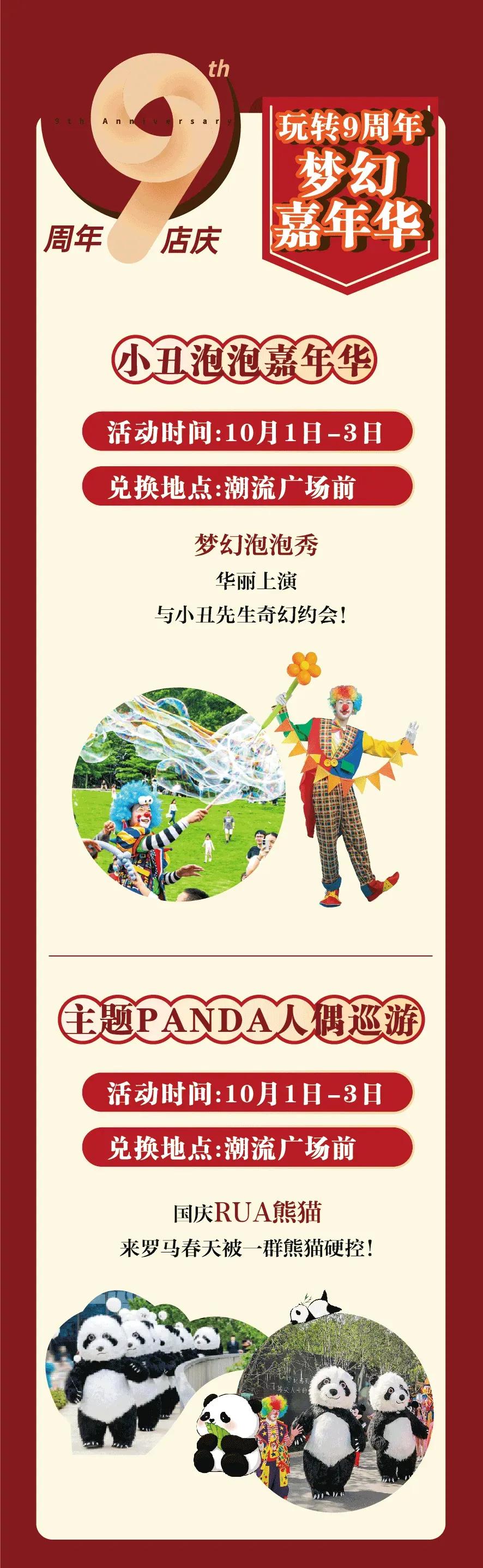 位于江夏庙山的罗马春天国际奥莱小镇,转眼已经开业9周年!为庆祝九周年!该商业体购物狂欢盛宴来袭!安排了一系列活动,包括露营音乐会、小丑泡泡梦幻嘉年华、熊猫人偶巡游,还有9米蛋糕免费吃!带你玩转十一假期!武汉城市周边游