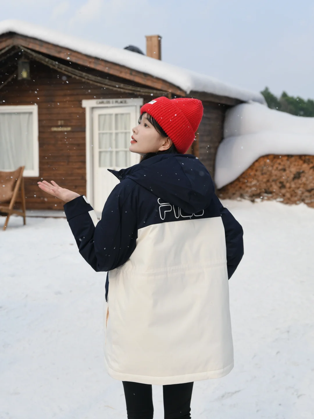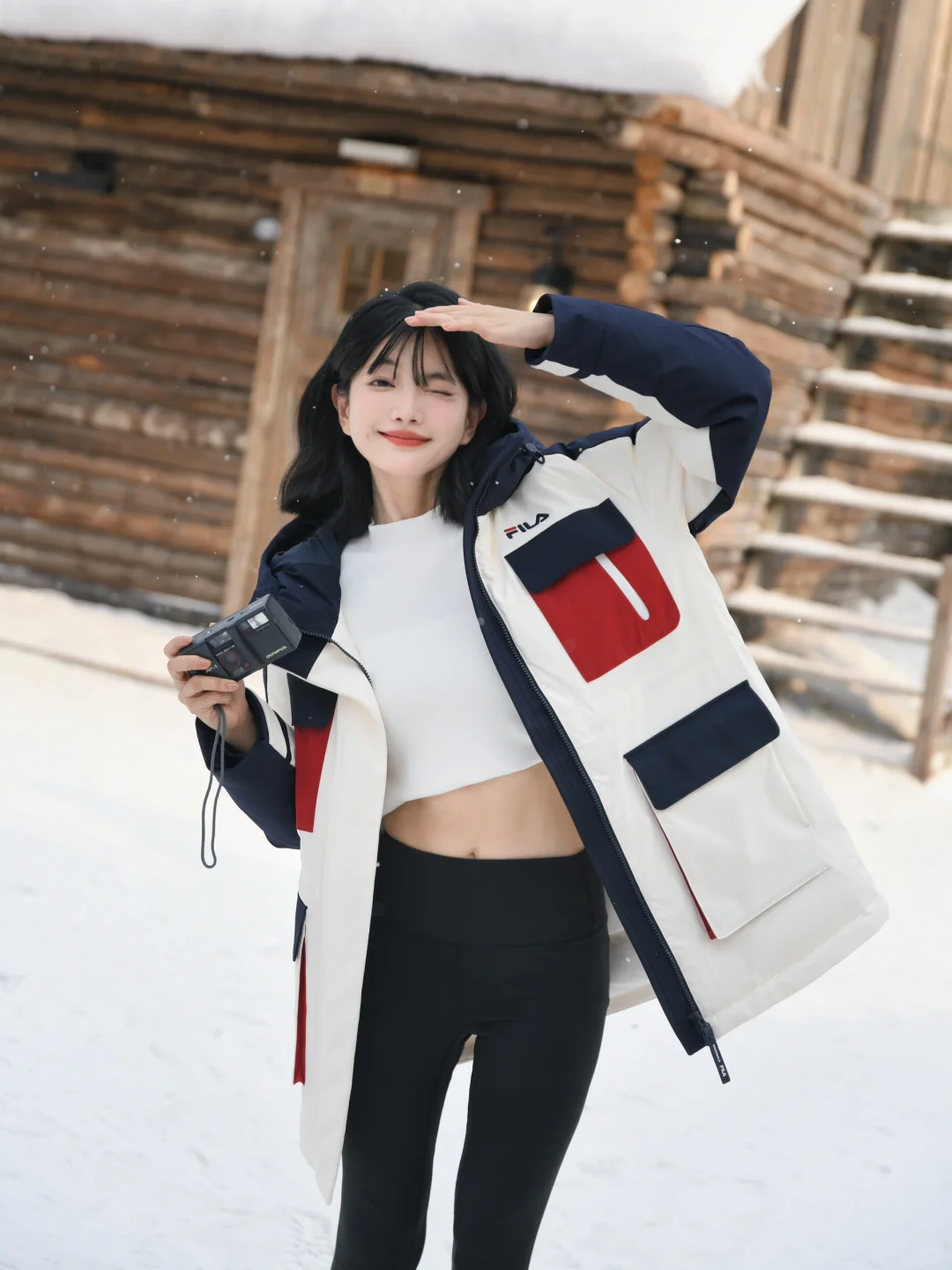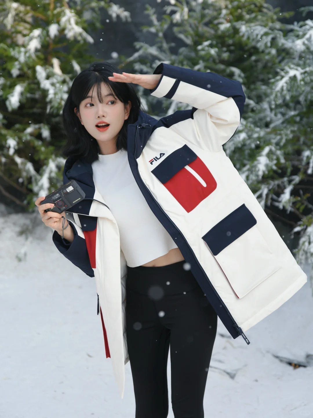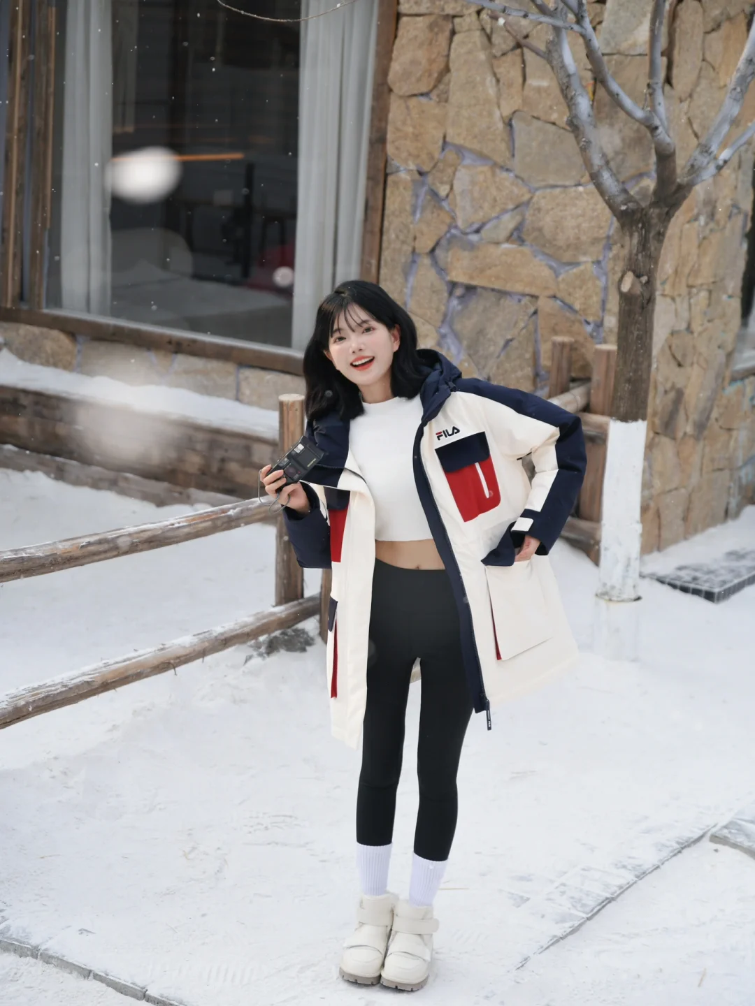 再套上FILA派克羽绒服 长度刚刚好