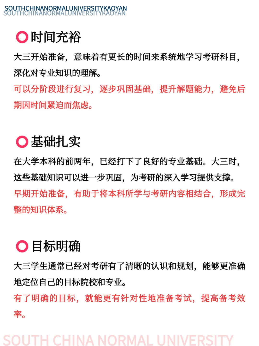 大三有更多的时间来收集考研相关信息,如目标华南师范大学的招生简章、考试大纲、历年真题等。