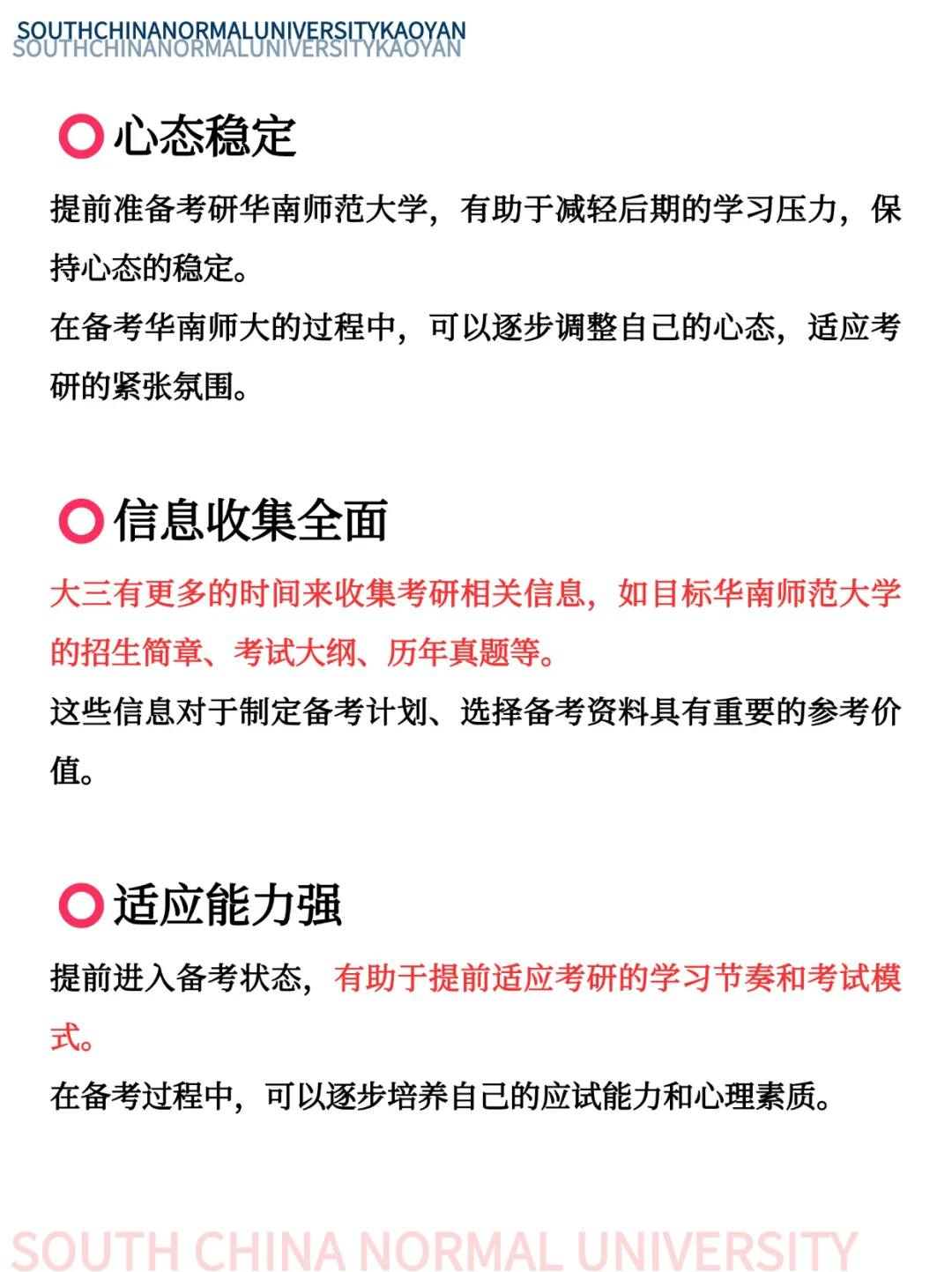 提前准备考研华南师范大学,有助于减轻后期的学习压力,保持心态的稳定。