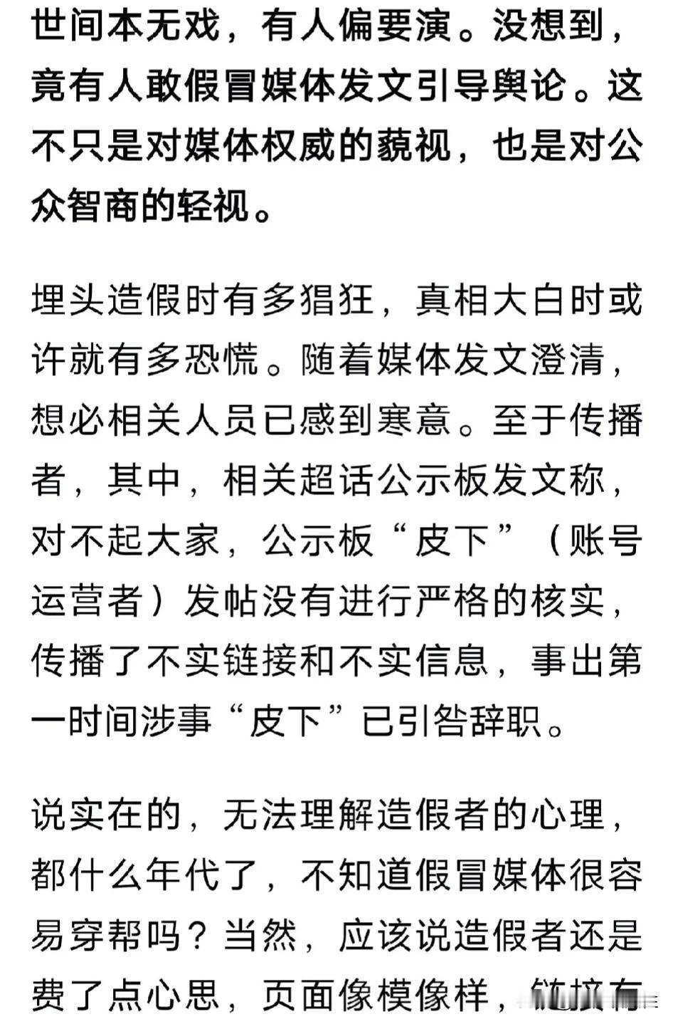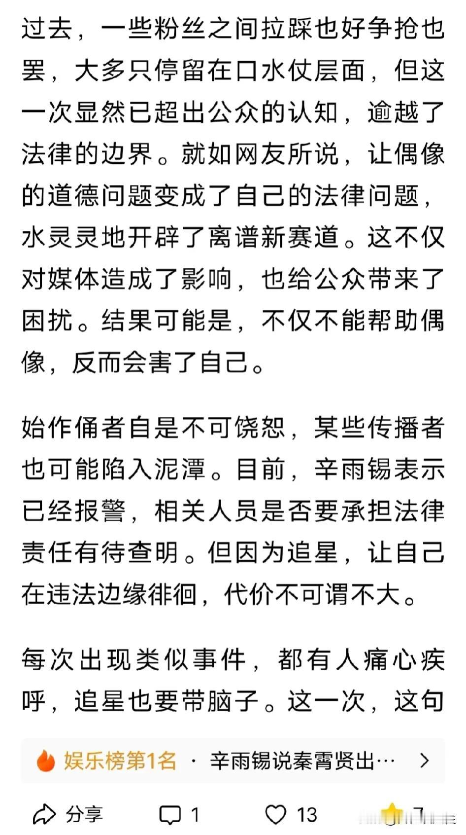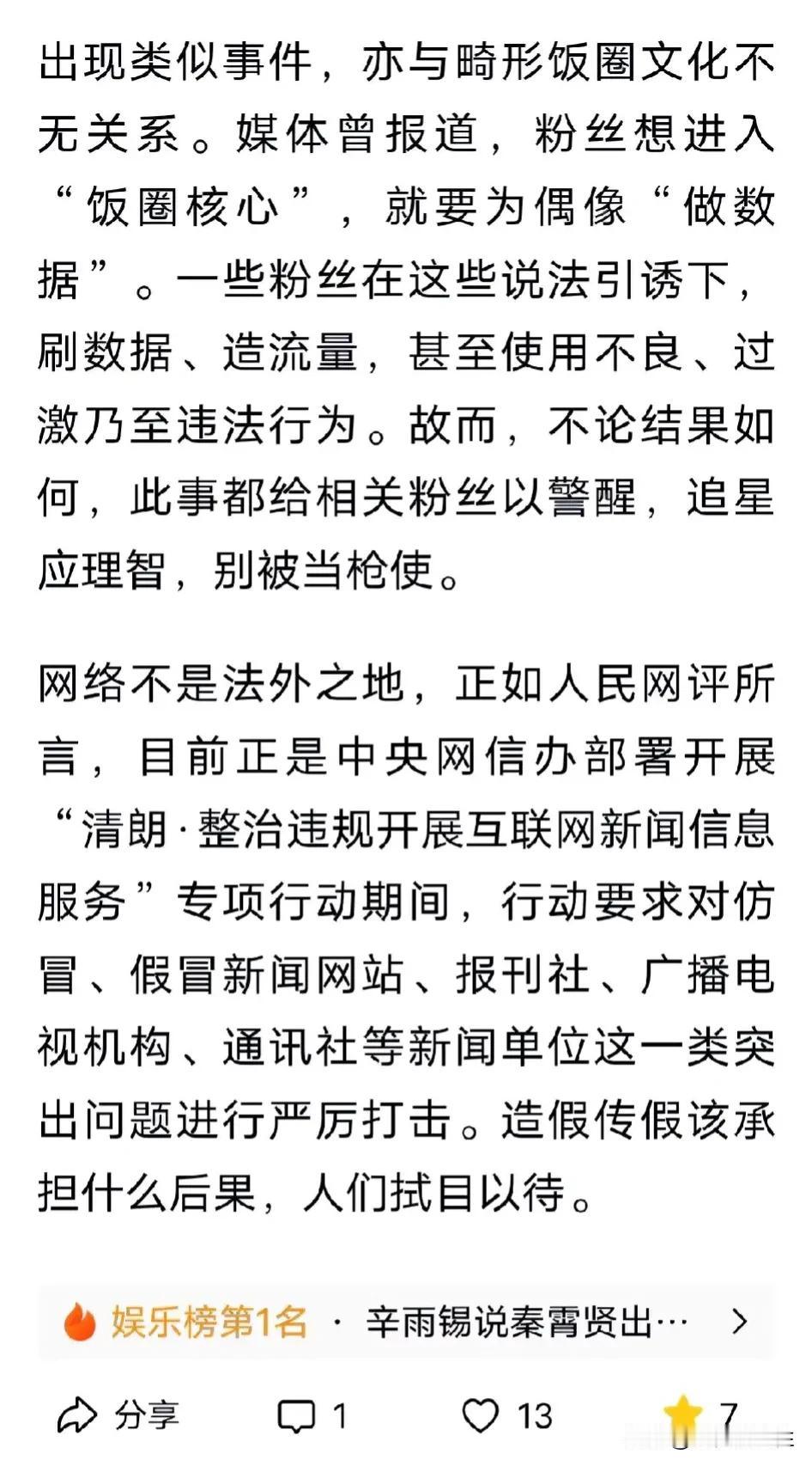 这下好了,红星新闻对假冒“”人民网文章”带节奏做出评论! “对权威媒体的藐视,对公众智商的轻视”!真是追星让人丧失理智,难道这个不会露馅的吗? 让偶像的道德问题,变成自己的法律问题! 红星新闻最后的论述是点睛之笔,那就是饭圈文化! 相信很多人之前都没有听说过秦霄贤这个人,没想到他的饭圈居然那么厉害!我觉得,不拒绝饭圈的偶像,不值得追!深陷饭圈文化的粉丝是可悲的,他们已经分不清是非善恶,其实最终轻视的是自己,让自己卑微的爱都不值得!