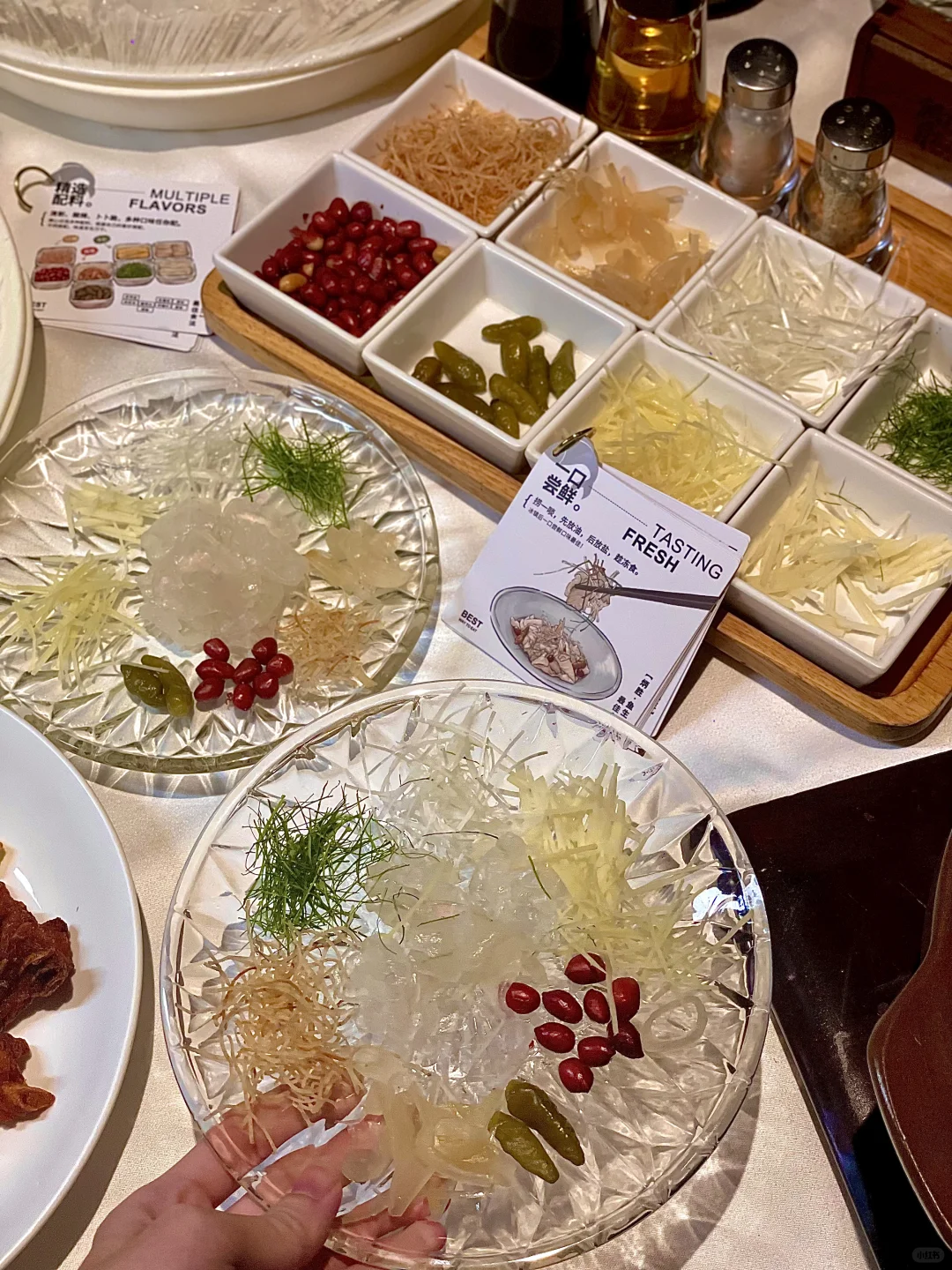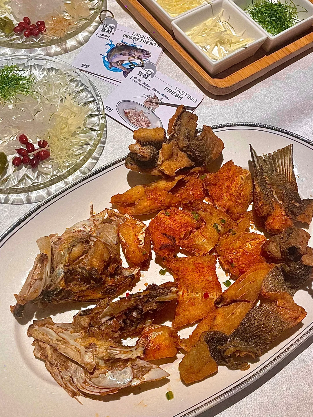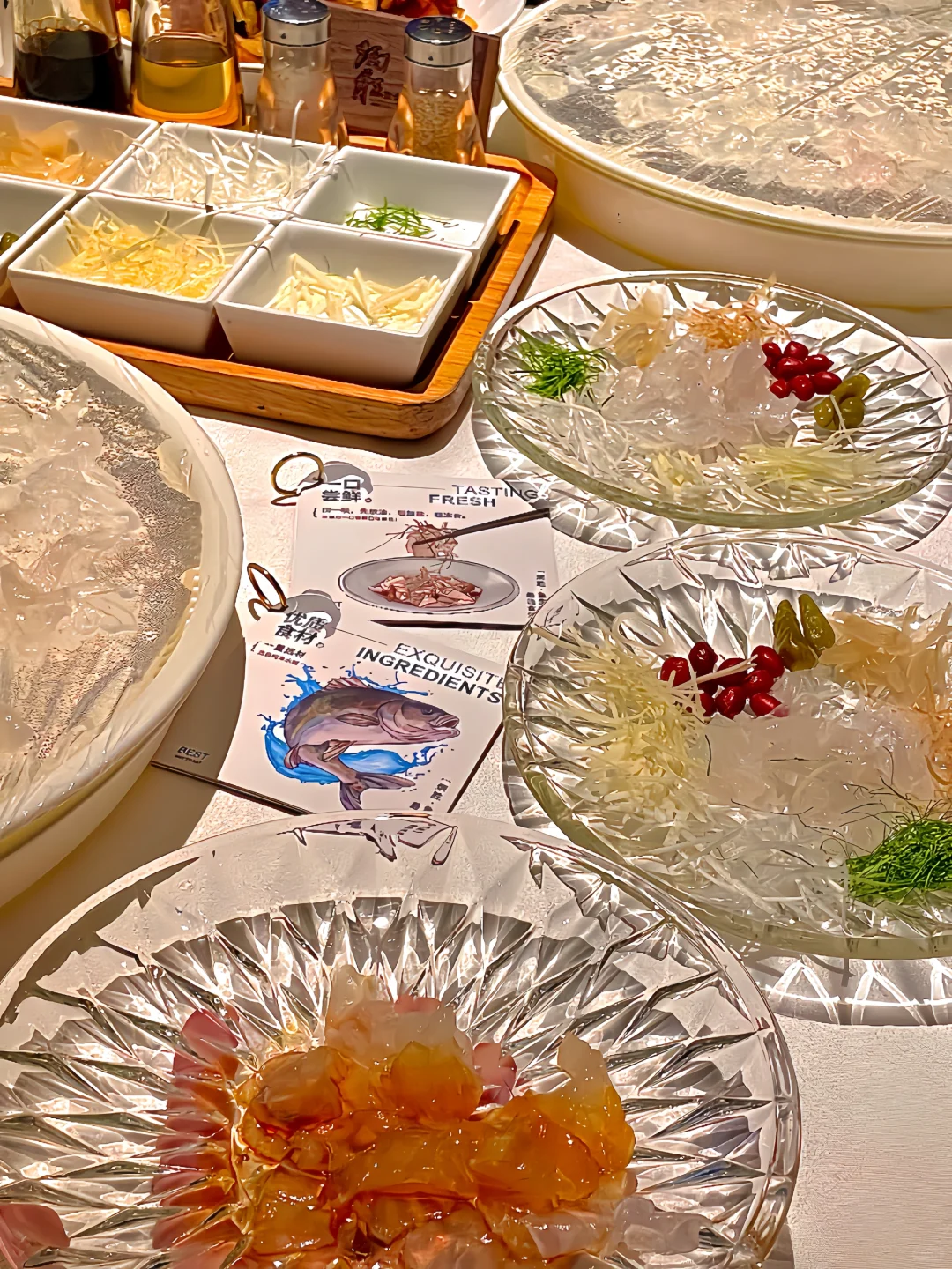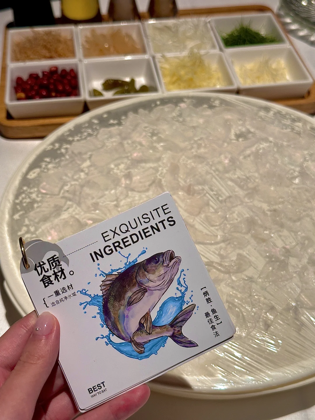 首先登场的是 **海鲈鱼生** 🐟,这道菜的颜值真的超高,鱼片薄如蝉翼,透明得可以看到下面的盘子,搭配上十多种调料,想怎么捞就怎么捞,简直是视觉和味觉的双重享受。尤其是用花生油、柠檬叶、海盐、花生调味后,口感更加丰富,每一口都是惊喜。