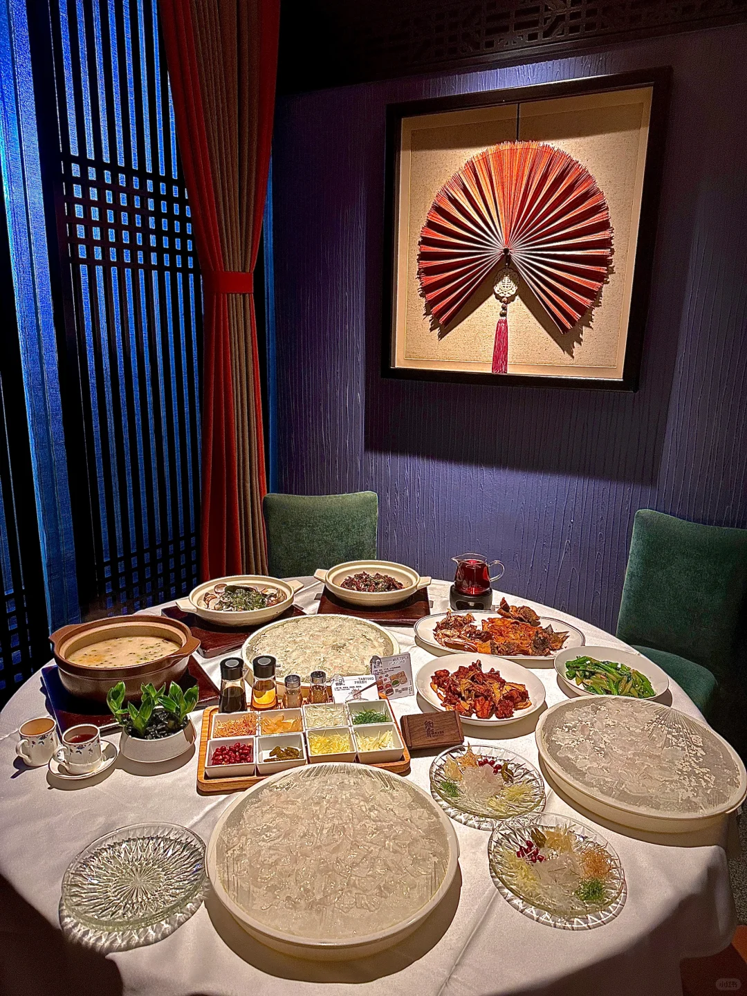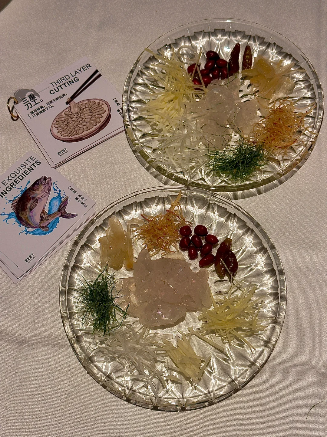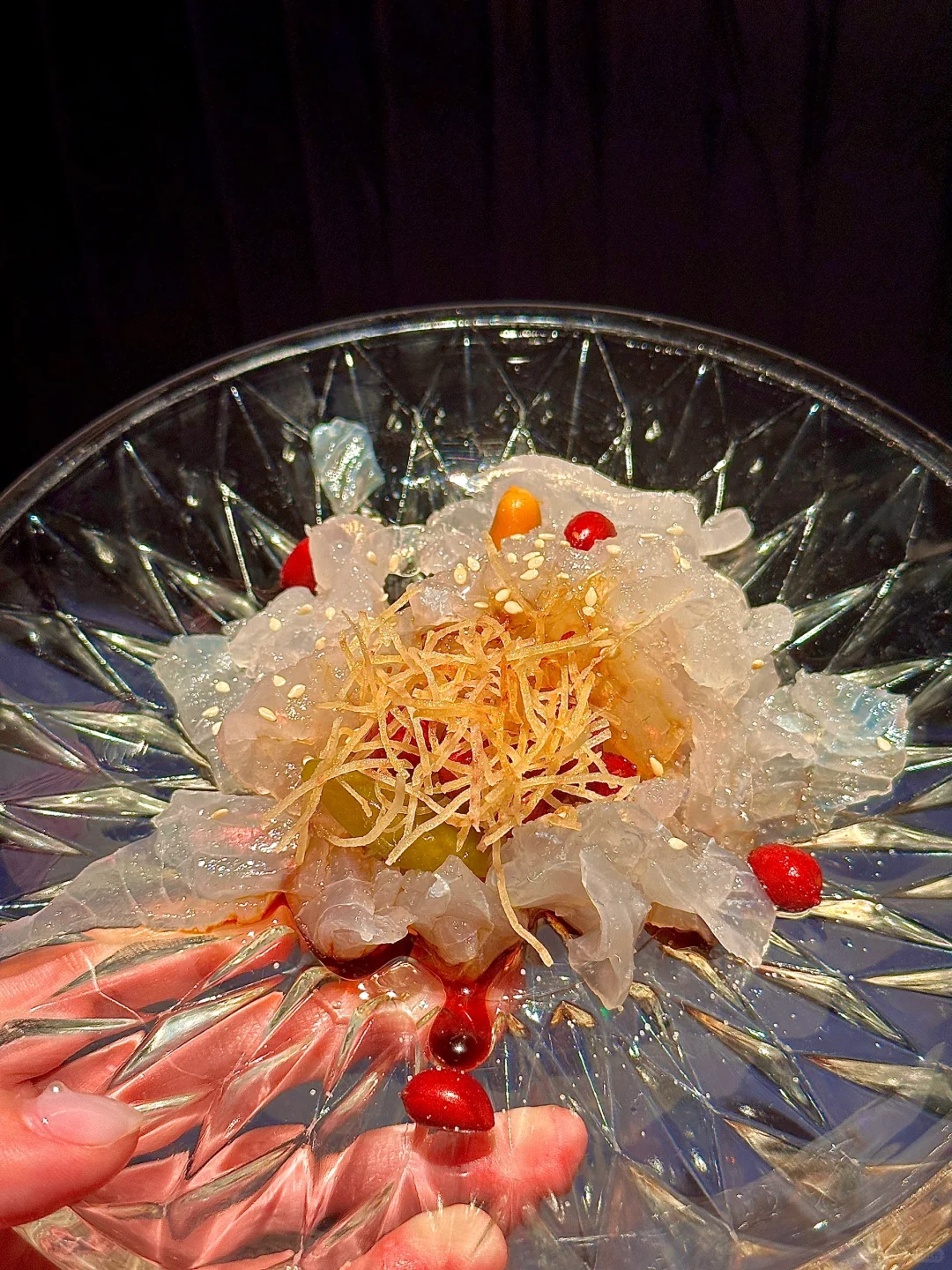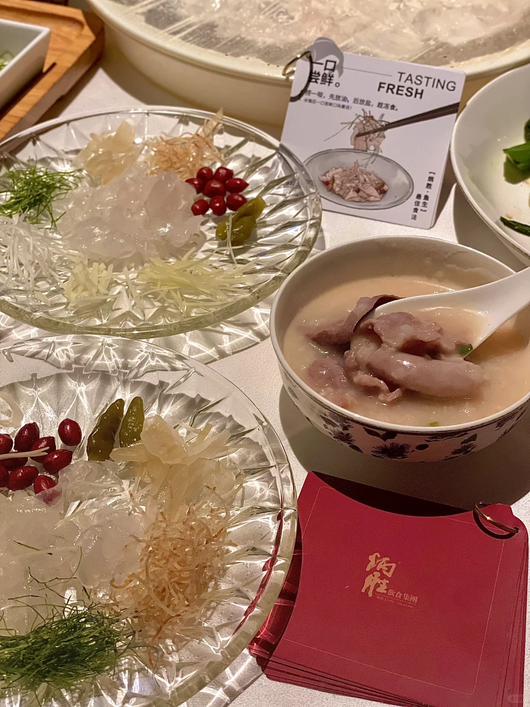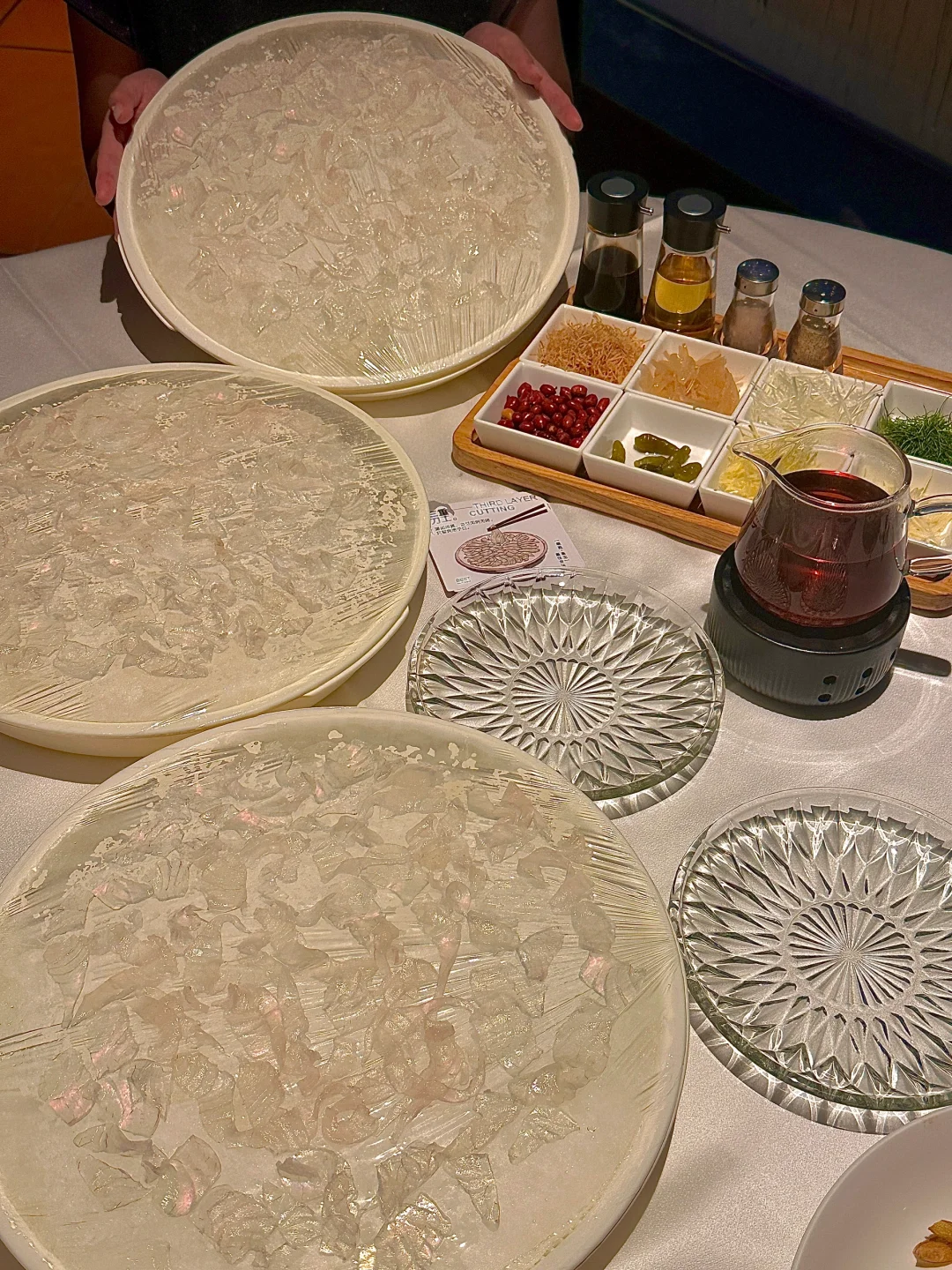 首先登场的是 **海鲈鱼生** 🐟,这道菜的颜值真的超高,鱼片薄如蝉翼,透明得可以看到下面的盘子,搭配上十多种调料,想怎么捞就怎么捞,简直是视觉和味觉的双重享受。尤其是用花生油、柠檬叶、海盐、花生调味后,口感更加丰富,每一口都是惊喜。