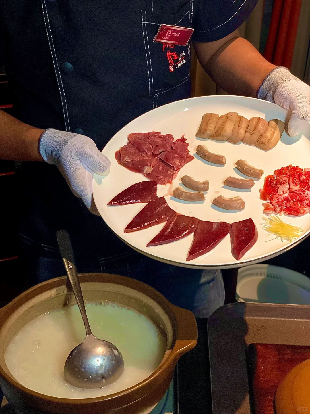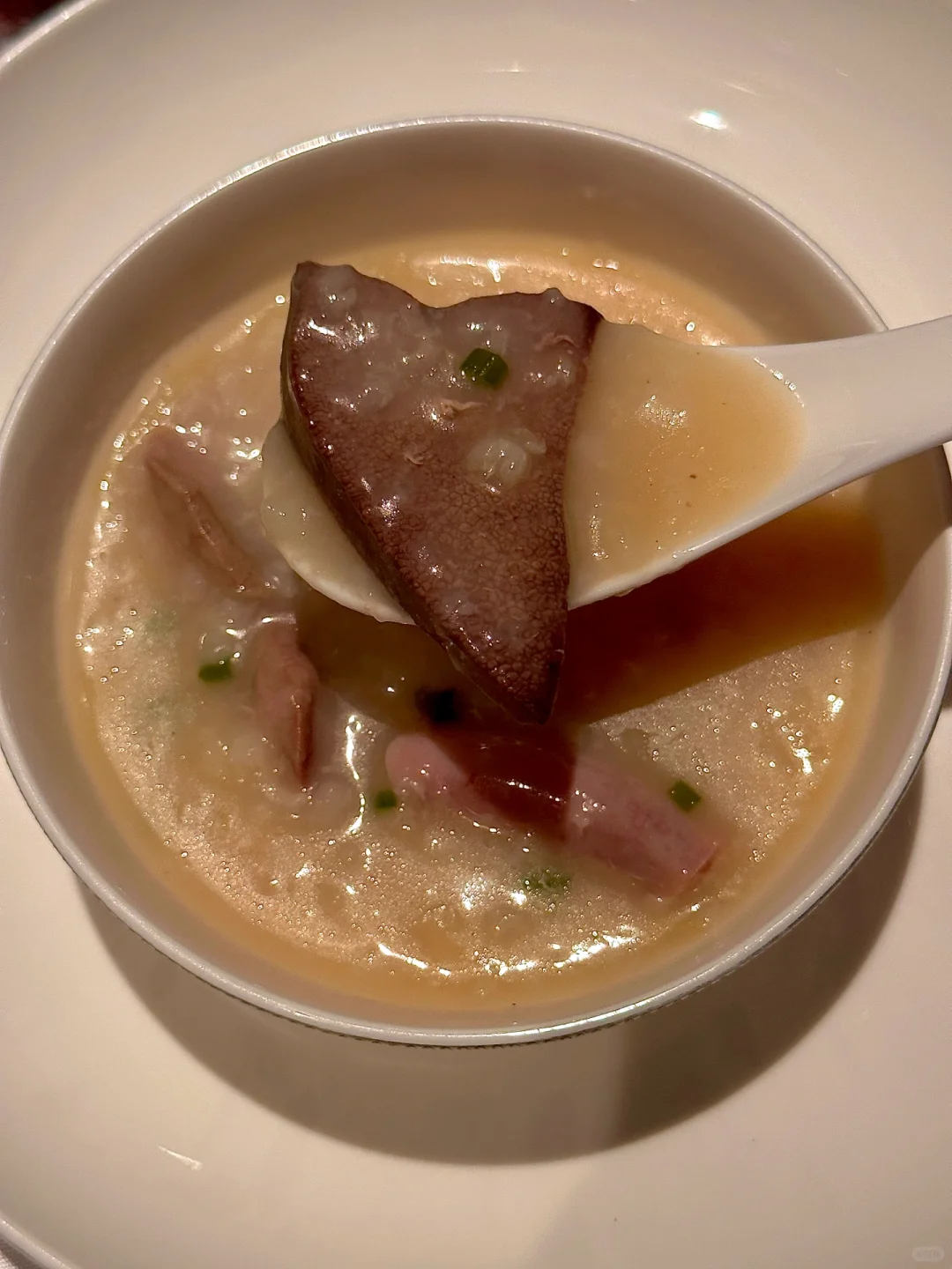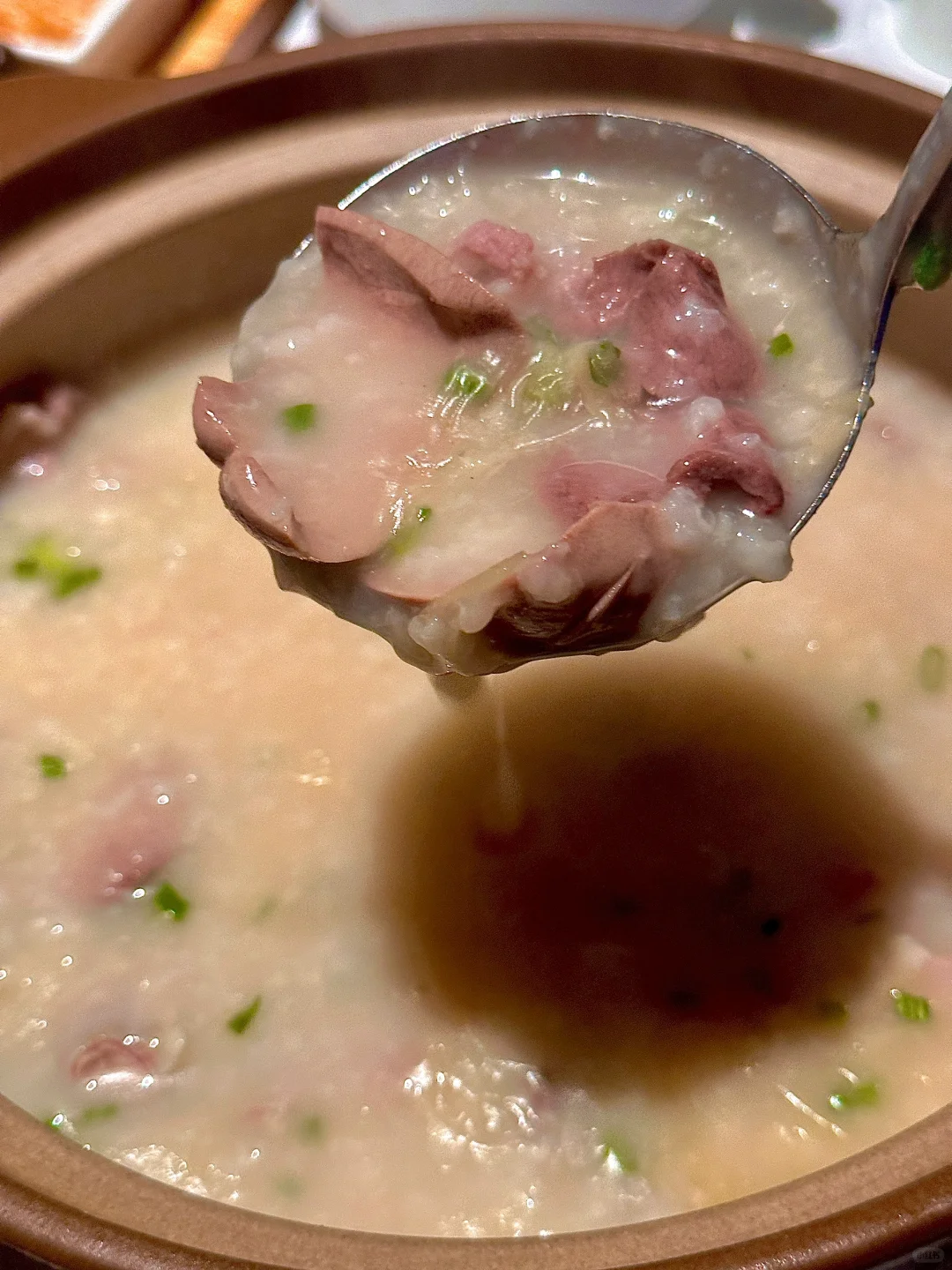 再来一碗 **顺德猪杂粥** ,这可是我的心头好。猪杂粥里的食材新鲜到让人忍不住夸赞,用山泉水和精选大米熬制的粥底,稠而不腻,米香四溢,每一口都能感受到食材的原汁原味,配上鱼生,简直就是人间美味。
