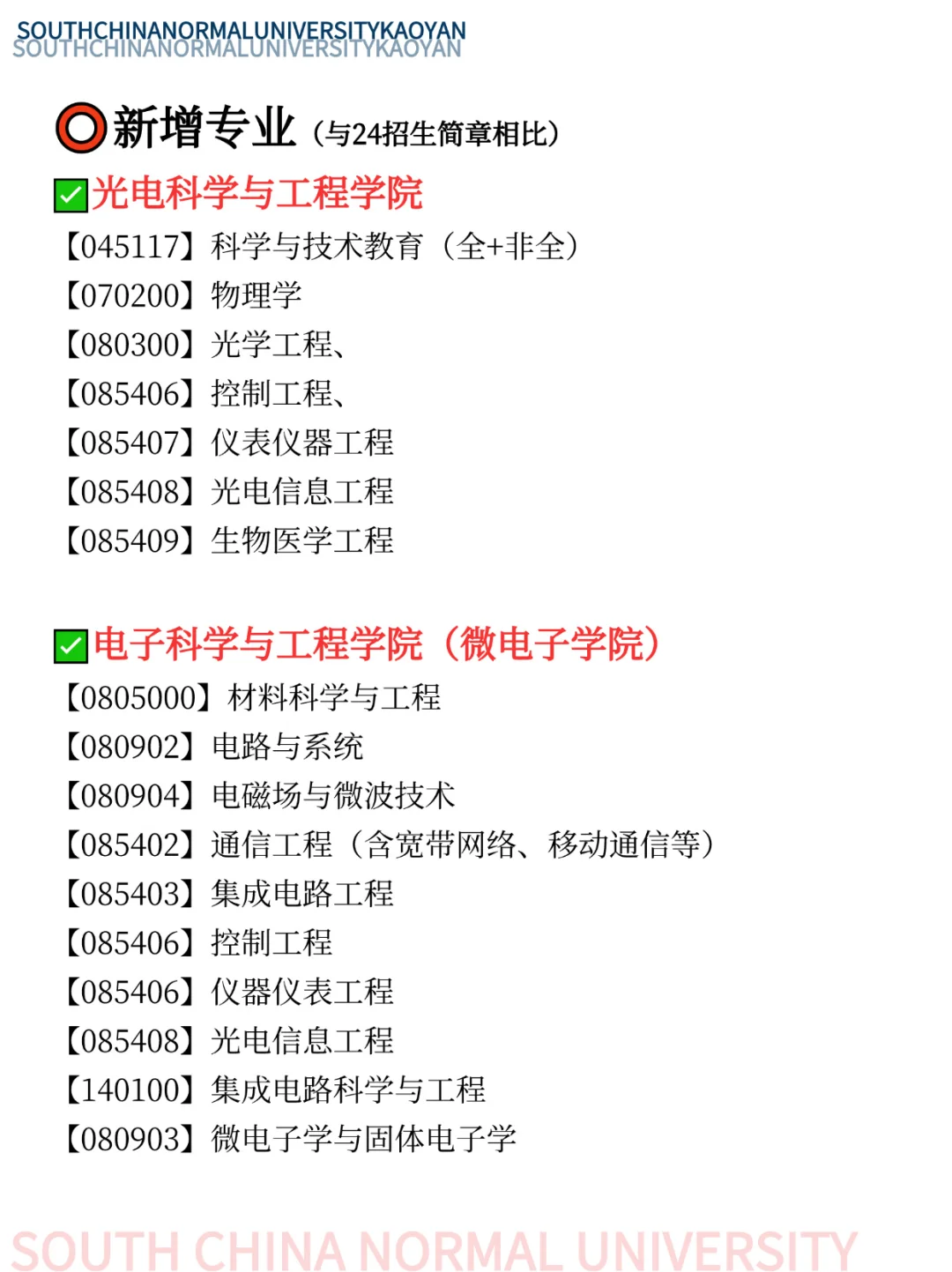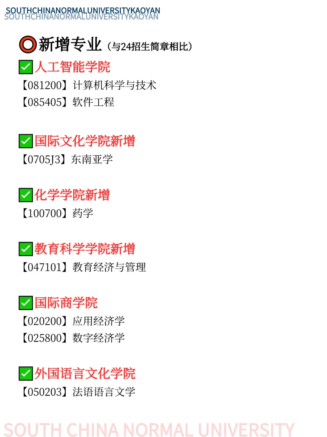25考研华南师范大学的宝子们注意了,25华南师范大学考研的招生简章已经出来了,对比24年的招生简章可以发现,有31个新增专业招生。
