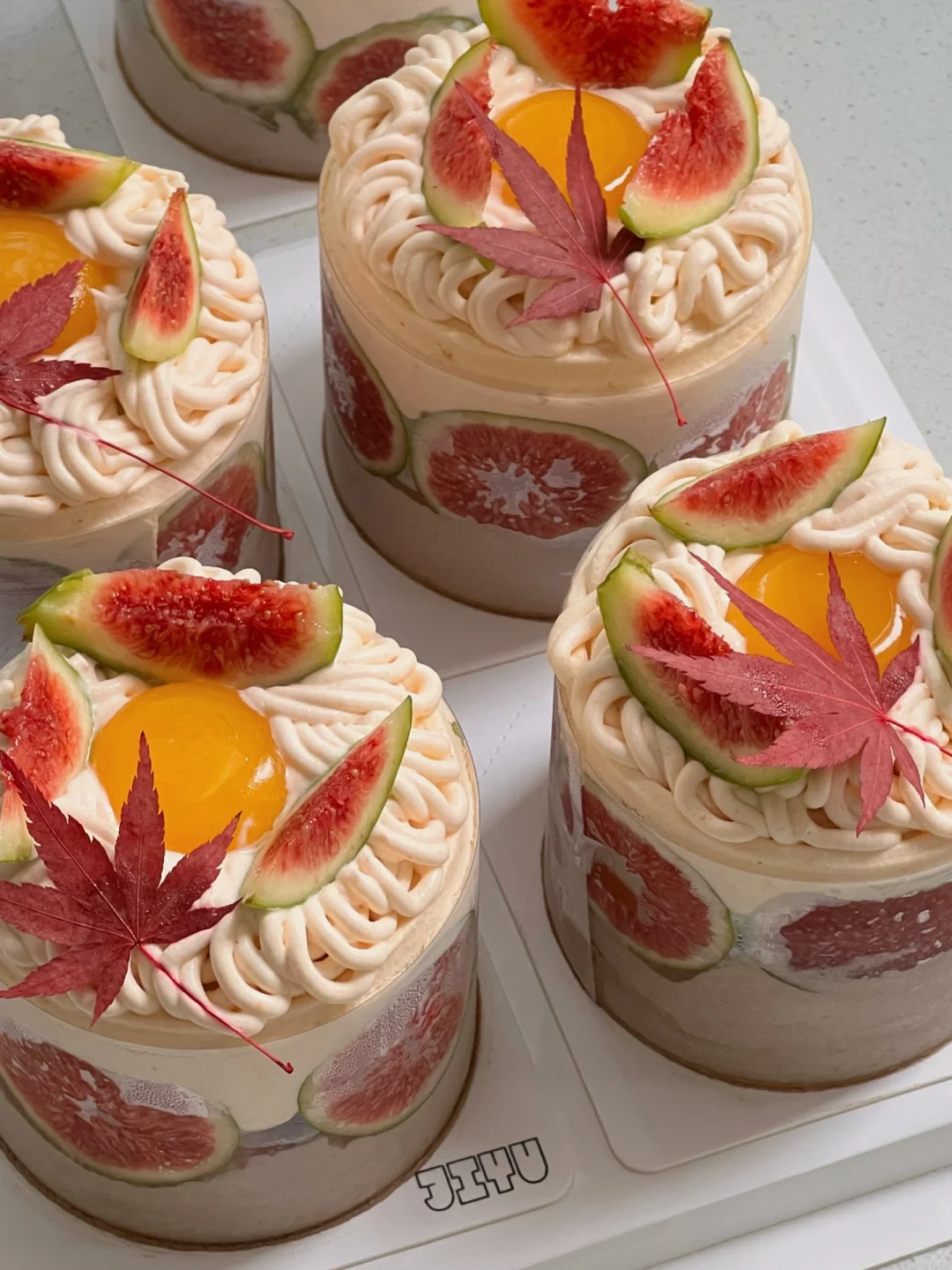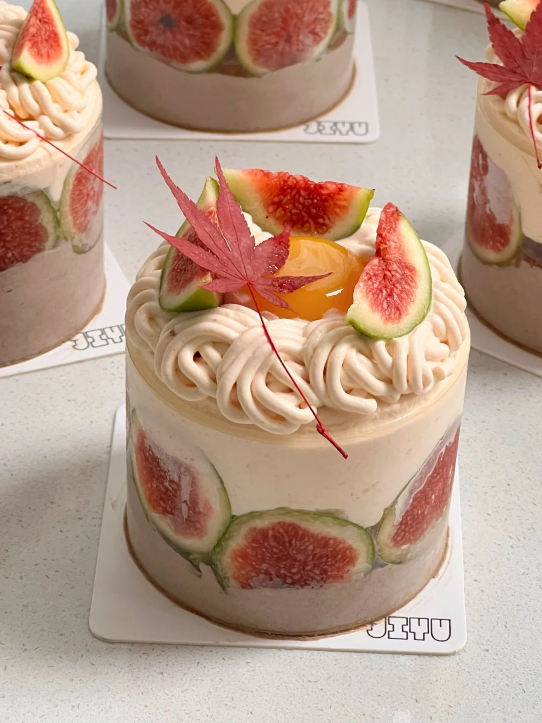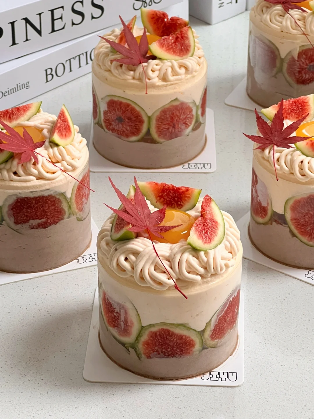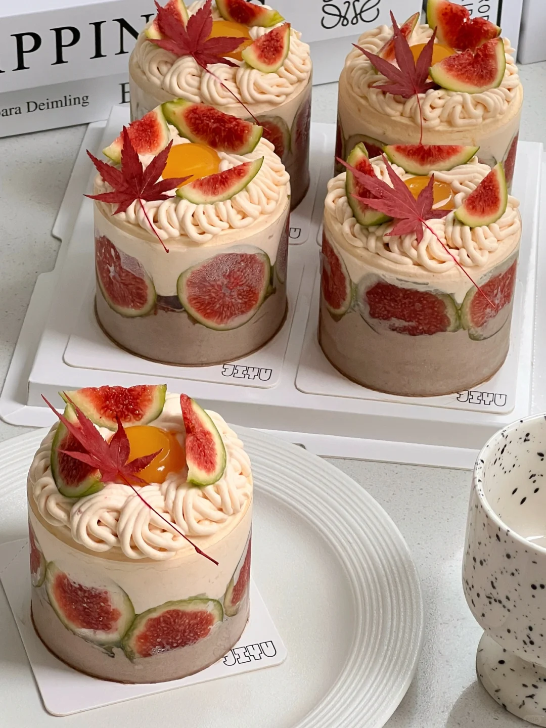 成都蛋糕·几鱼蛋糕课新口味🍁无花果焙茶柿子 四季特调口味蛋糕 秋冬新品🍁无花果焙茶柿子蛋糕 咱们分别是一个5寸加高和一个小3寸的装饰 上个月研发新品做的五寸加高还没有买到青皮无花果,后面直接网购了青皮无花果做了熬酱、夹层及装饰~非常的出片儿,并且个人认为青皮无花果的香味更好吃😋 新鲜的青皮无花果去皮入厚片,整个蛋糕没有过多的堆砌 搭配的焙茶奶油丰富了整体口感!全然仰仗的新鲜朴实的自然滋味~