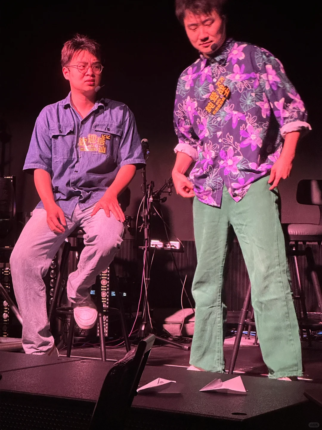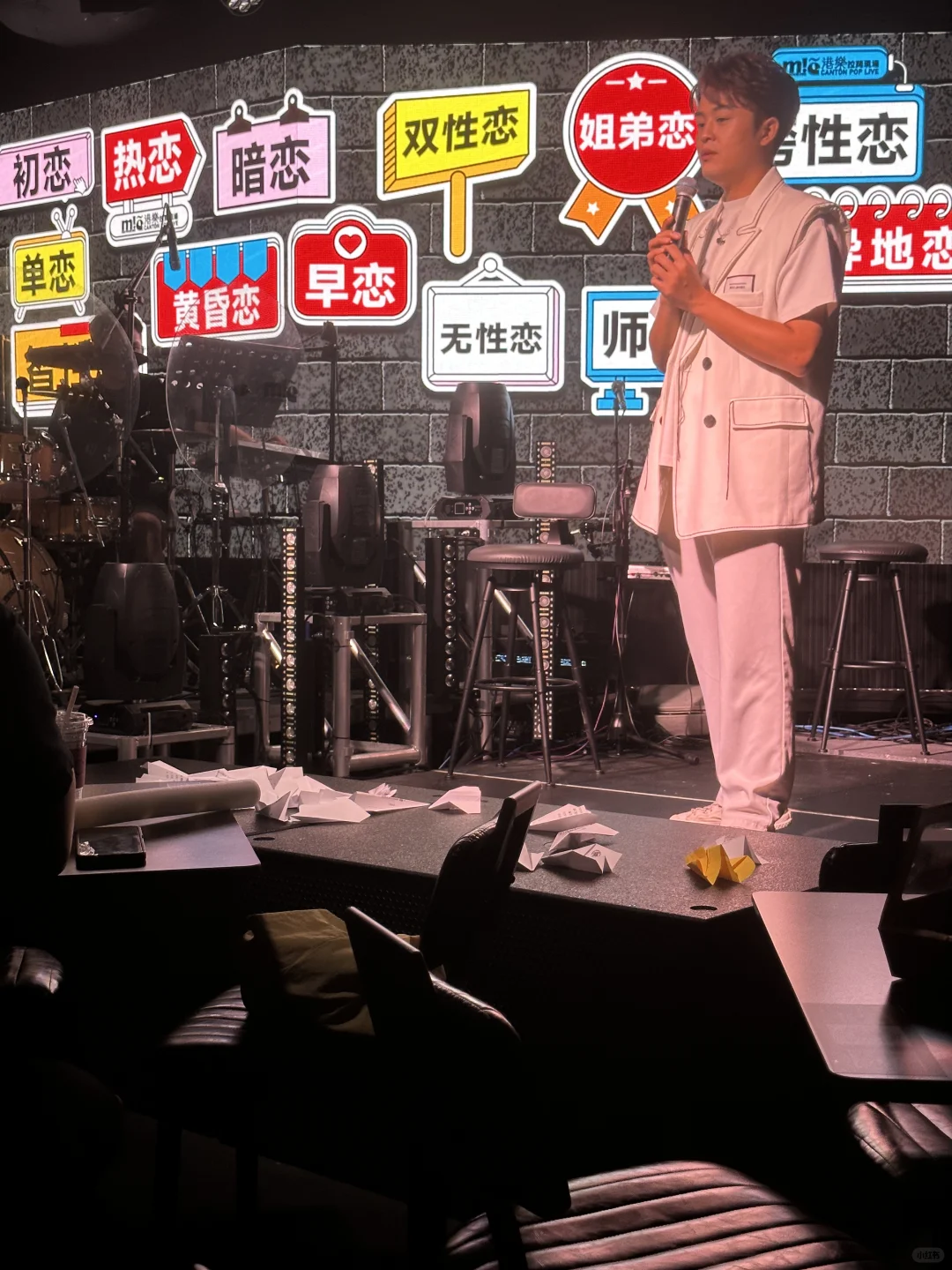 當主持人大叫開始時,我哋就要將紙條摺成紙飛機飛上台,演員會隨機撿起紙條讀出嚟,然後即興反應。