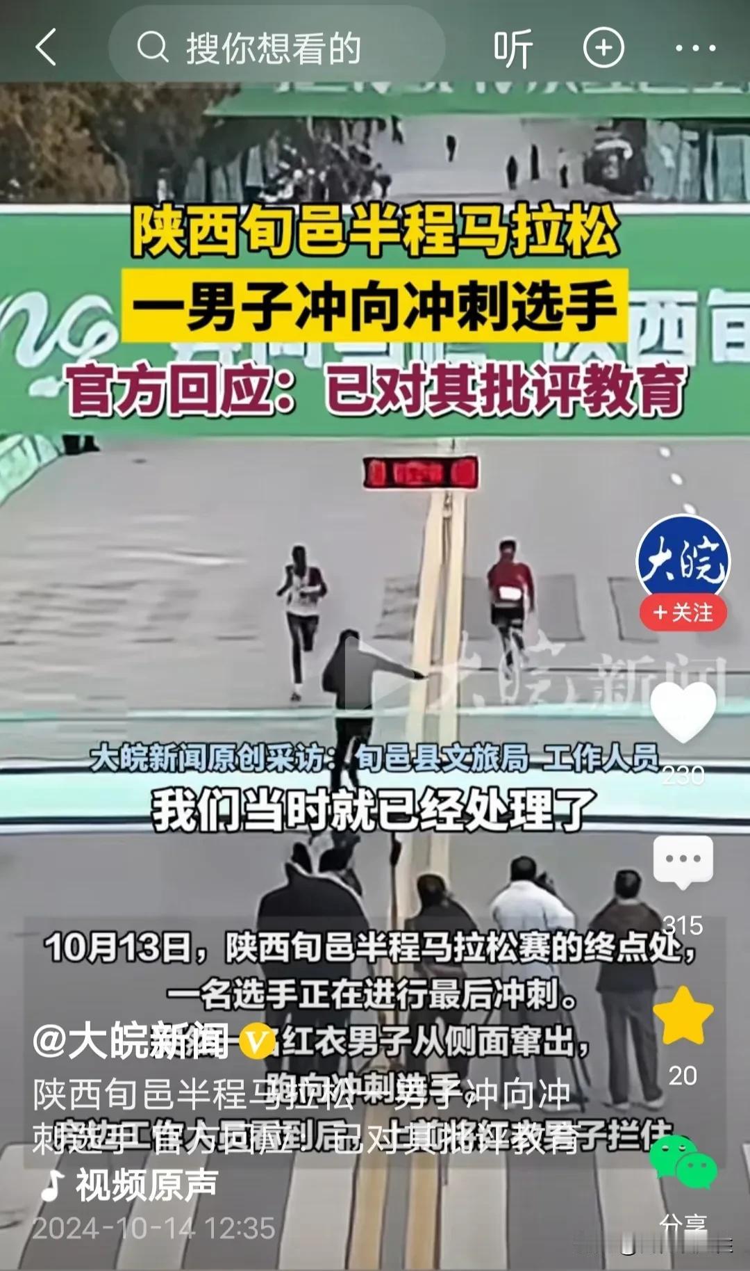 有什么可怀疑的呢? 陕西旬邑半马比赛,一男子冲向冲刺选手被阻拦! 男子虽然穿着比赛的衣服,但文旅局也回应了,是想跑去跟选手合影,蹭流量的! 为什么还有那么多人怀疑呢?以前半马比赛也出现过很多情况,总有人怀疑针对中国人,不想让中国人夺冠!可能吗?你没有看到跑在最前面的那个是黑人吗?中国人半马跑得过黑人的有多少呢?哪有那么多崇洋媚外的呢?