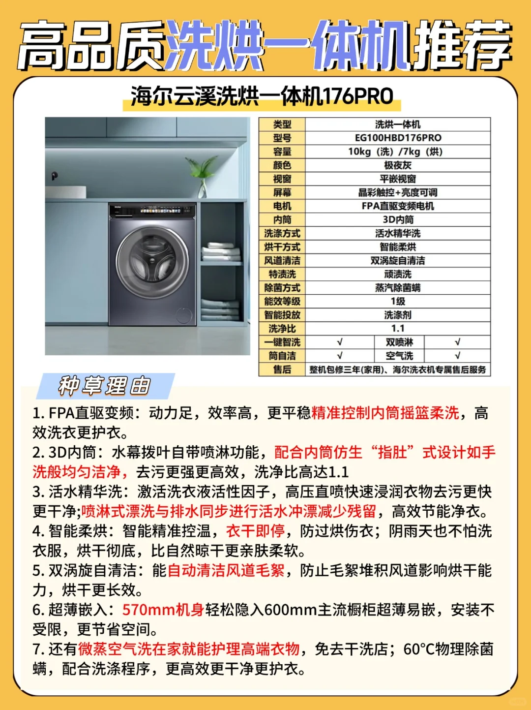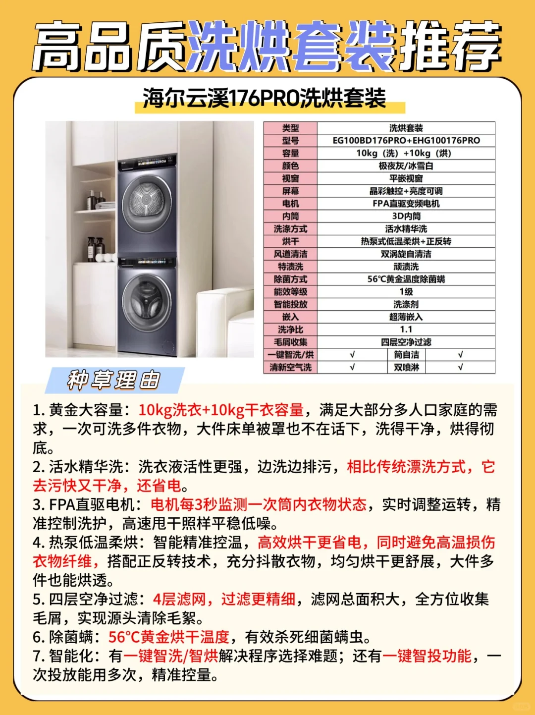 [彩虹R]当然,它们也各有特色优势,像是176PRO洗衣机有6大特渍洗程序专门针对各种顽固污渍,还有双喷淋避免泡沫残留和窗垫发霉;176PRO洗烘一体机特有的智能柔烘可精准控温,衣干即停、防过烘伤衣。还有双涡旋自清洁可以自动清洁风道毛絮,它的空气洗功能可以免去干洗店,在家就能护理高端衣物;176PRO洗烘套装则是独具热泵低温柔烘,高效烘干又省电,还呵护衣物。并且具备四层毛屑收集功能,在源头清除毛絮。
