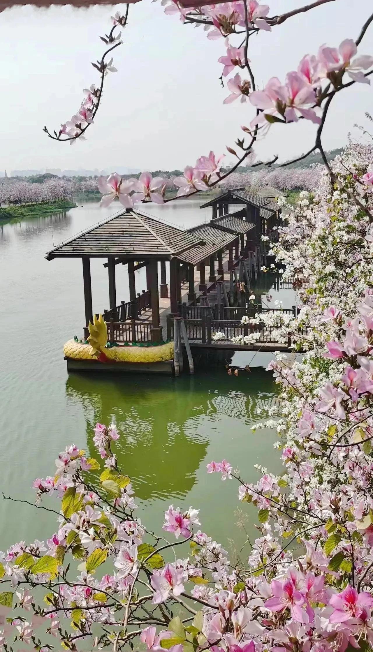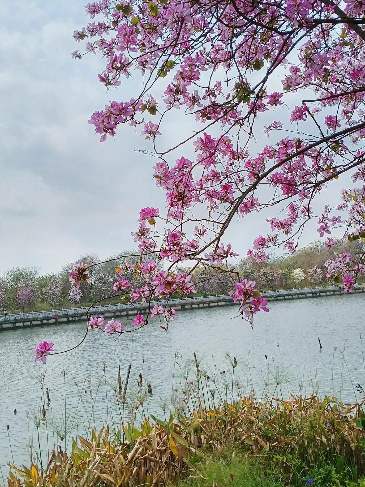#原创·湿地公园随手拍# 一排排的紫荆花,粉色与白色的花朵互相映衬的粉色花廊。 粉红粉白的紫荆花生长在湖边,探出头来,错落有致,有的枝条伸到湖面上,与碧绿的湖水、湛蓝的天空以及岸上的亭台楼榭互相映衬,优雅浪漫,简直美出了天际。 白花紫荆纯洁高雅,花开时状如蝴蝶,缀满枝头,恬静优雅,一阵微风吹来,洁白的花瓣随风飘落,洋洋洒洒,就像下着一场花瓣雨。