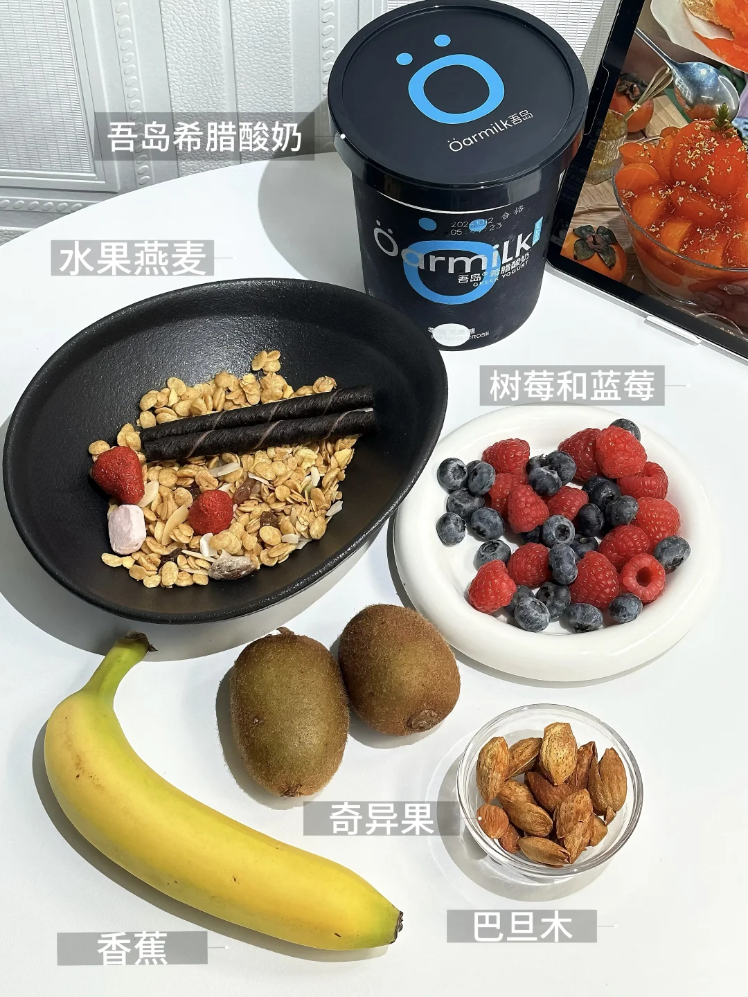 吾岛希腊酸奶 | 蓝莓🫐 | 烘焙燕麦 | 香蕉 | 树莓| 奇异果| 巴旦木|麦片