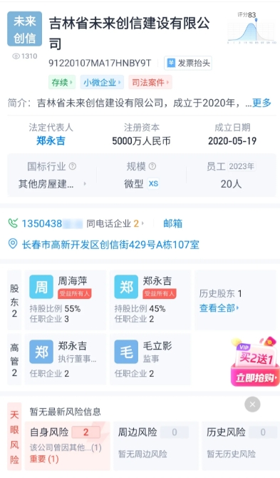 天眼查显示,该公司成立于2020年,注册资本5000万元,员工目前有20多人,具备多项建筑资质,项目负责人具备二级注册建造师证书。
