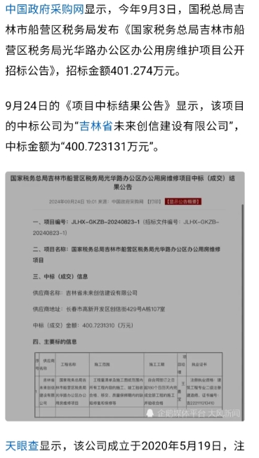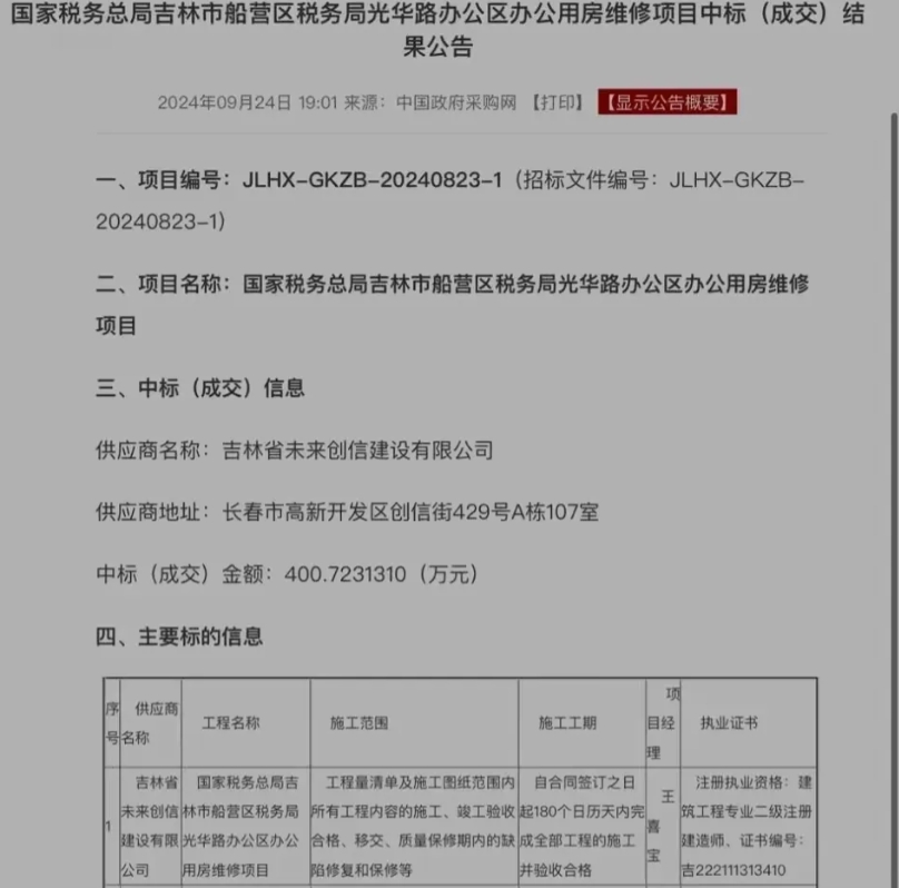 本项目招标金额401.274万元,根据9月24日《项目中标结果公告》,该项目的中标单位为:吉林省未来创信建设有限公司”,中标金额为“400.723131万元”,比招标价格低了5000多元。