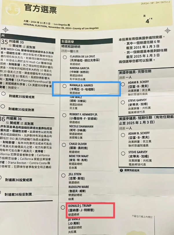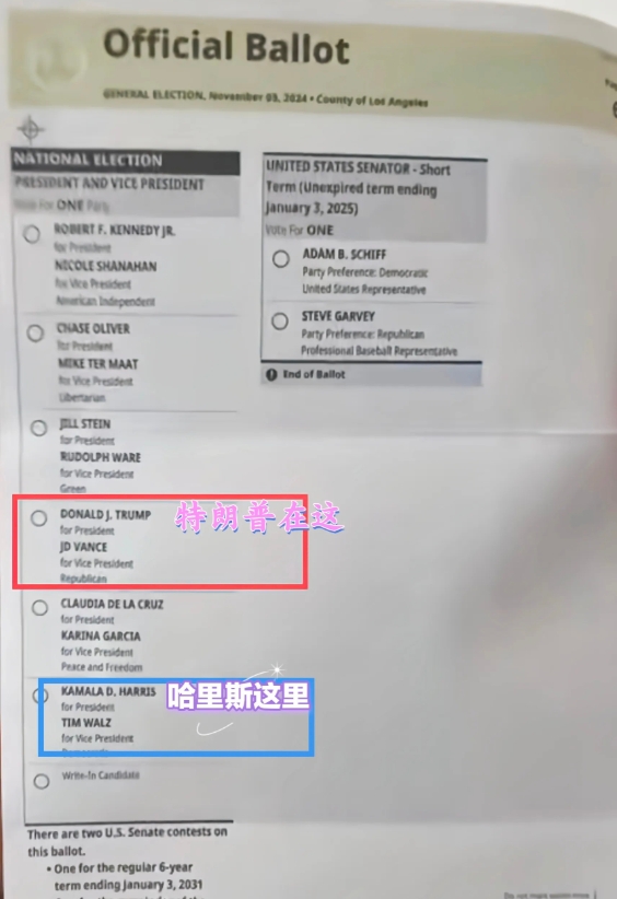 最后才是重中之重的美国总统和副总统候选人的部分,上面可不止有唐纳德·特朗普、万斯、卡玛拉·哈里斯、沃尔兹等共和党与民主党总统副总统候选人,还有自由党的奥利弗、独立党的小罗伯特·肯尼迪、绿党的吉尔·斯坦等人,明知道这当中有些人已经宣布退选了,可是他们的名字还是在上面,这就是美国选票的一贯风格。