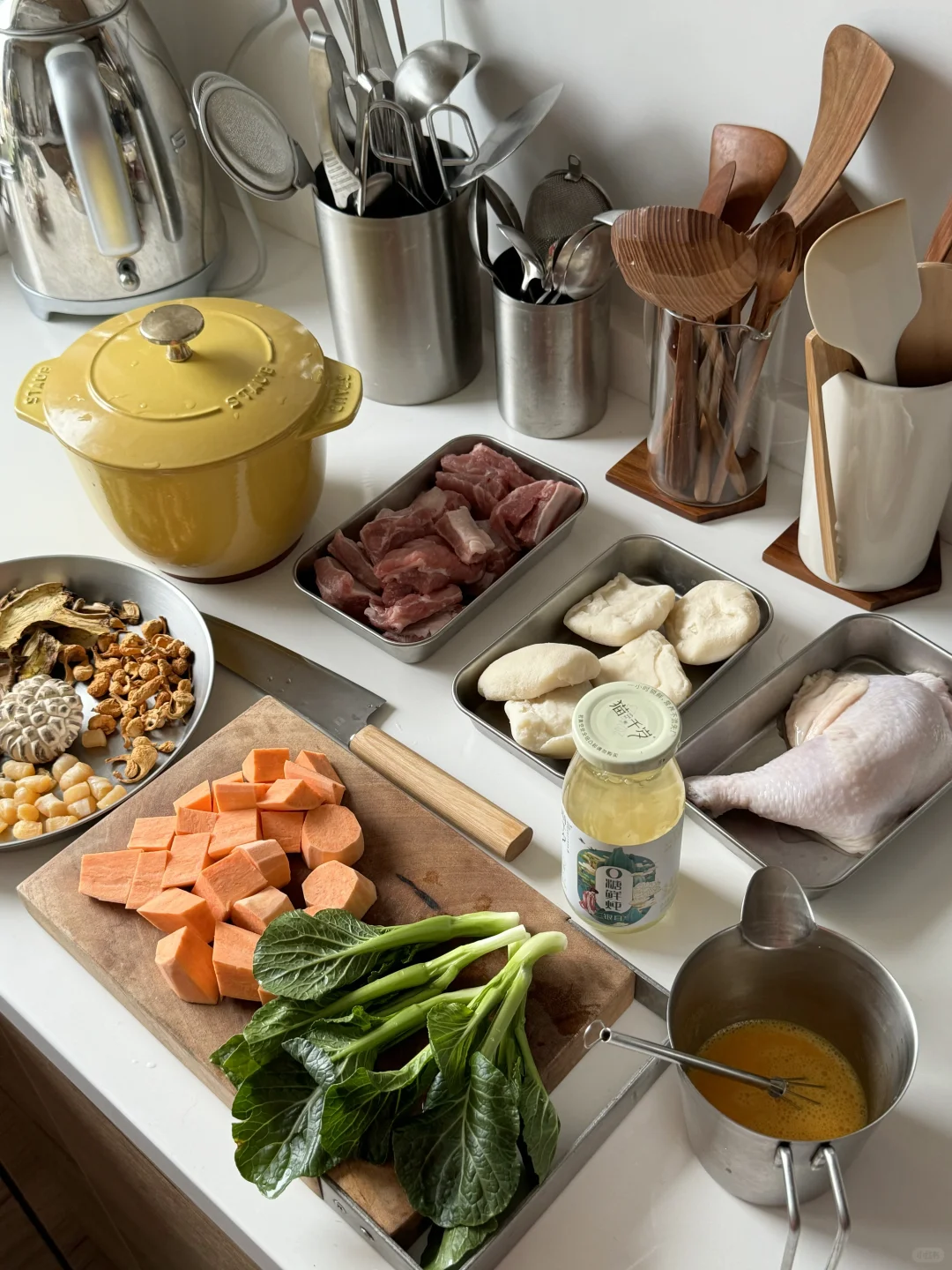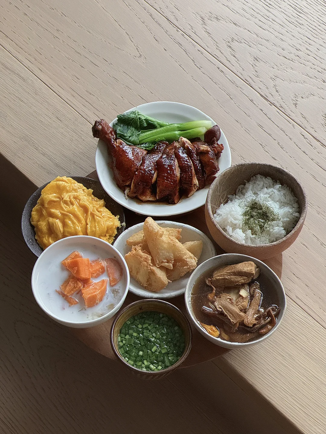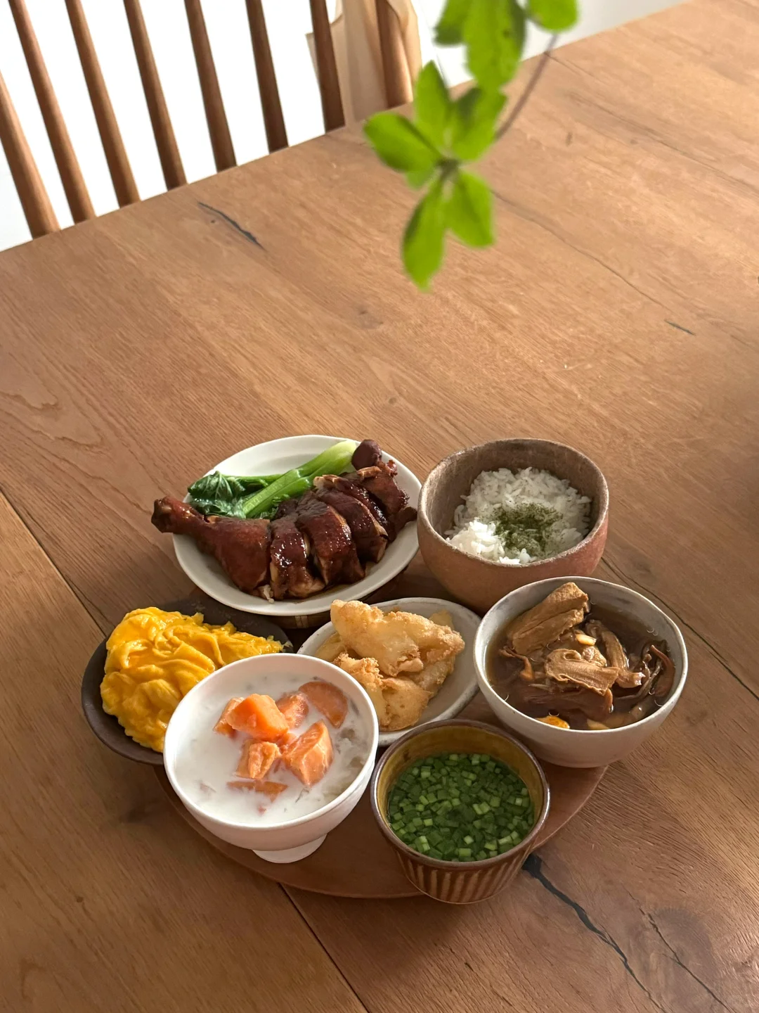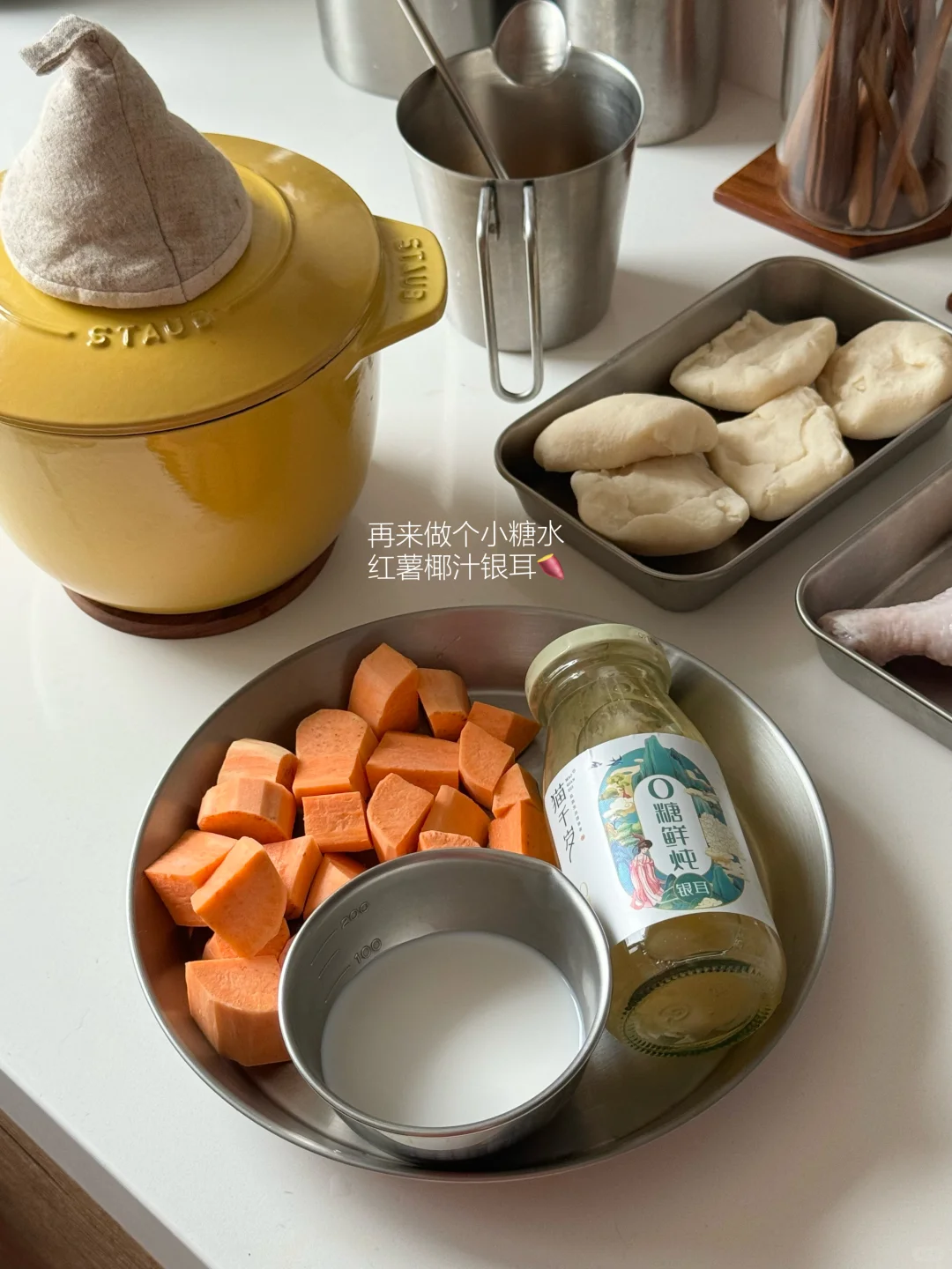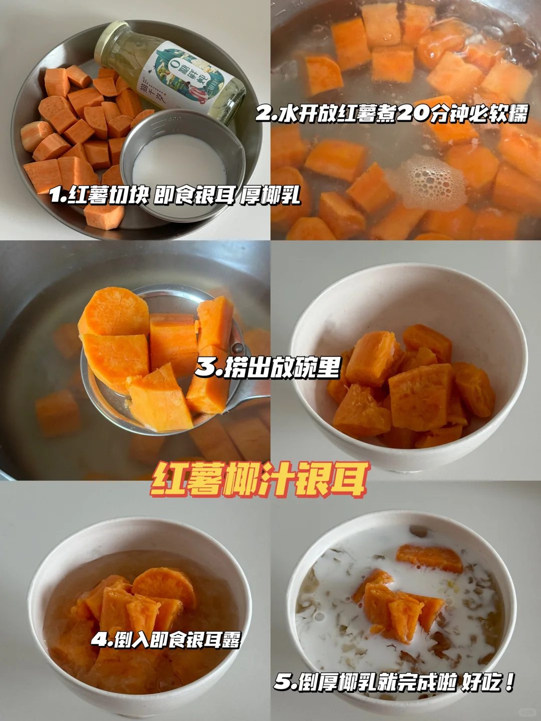 - 今日菜单📝 豉油鸡🍗 菌菇排骨汤🍄‍🟫 普宁豆腐🫓 黄埔炒蛋🍳 红薯椰汁银耳 - 家庭版豉油鸡🍗做法附图 技术点是鸡腿煎上色后 加酱汁和一碗热水焖煮 水不能多 太多的话 收汁时间过长 鸡肉易老 两个鸡腿20分钟就够了 中间需要不停翻面受热 红糖用来上色 让成品更好看 没有的话就用白糖。 - 黄埔炒蛋🍳做法附图 西餐里有一种英式炒蛋以丝滑绵密而著名 而源自广州黄埔码头是我们中国人的中式炒蛋 就是在蛋液里放入一些调味料 再加水淀粉 滑炒~ 鸡蛋要无菌的 油用花生油 香得你不认识回家的路。 - 红薯椰汁银耳做法附图 已经是秋天啦 最近每天一碗小甜品🍨 有手就会的小糖水必须按头安利给你们! 20分钟煮糯的红薯、芋头或南瓜 倒入椰汁 淋上一直喝的猫千岁0汤鲜炖银耳露🥰 配料表干净 0糖无负担 毕竟是银耳大品牌! 口感软糯 胶质满满 有种糊嘴的creamy感 早上 我还会拿它来制作银耳拿铁☕ 因为煮一锅银耳费时间 且根本喝不完 这样一瓶开盖即食特方便 才23大卡! 随时随地都能下午茶 真的没负担✌🏻 秋意浓 防燥正当时 大家要多吃白色食物呀!
