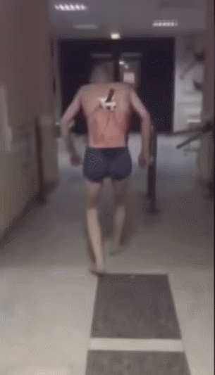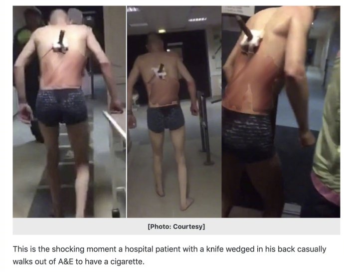 之前俄罗斯某医院的一位护士拍下了无比震惊的一幕: 一位男性患者身着四角内裤,背后插着一把刀,流着血蹒跚向室外走…医生看到连忙问他去哪,男子淡定回了一句“抽烟”就不顾阻拦冲到气温零下10度的室外,抽完烟又回到医院。 据悉该男子是拍完X光的间隙溜出去吸烟的,现在无大碍……