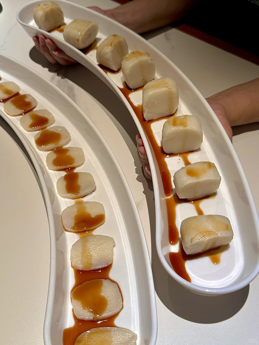 两大盘年糕超长、新奇,满满的江浙特色。一节节,一片片的年糕软糯香甜,蘸着黄糖汁吃真的太过瘾啦