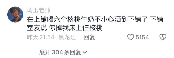 在上铺喝六个核桃牛奶,不小心洒到下铺了,下铺室友说:你掉我床上仨核桃。