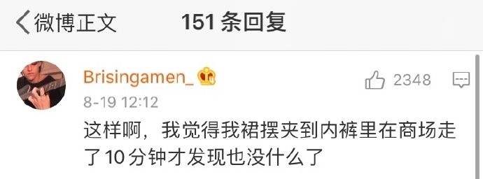 这样啊,我觉得我裙摆夹到内裤里在商场走了10分钟才发现,也没什么了。
