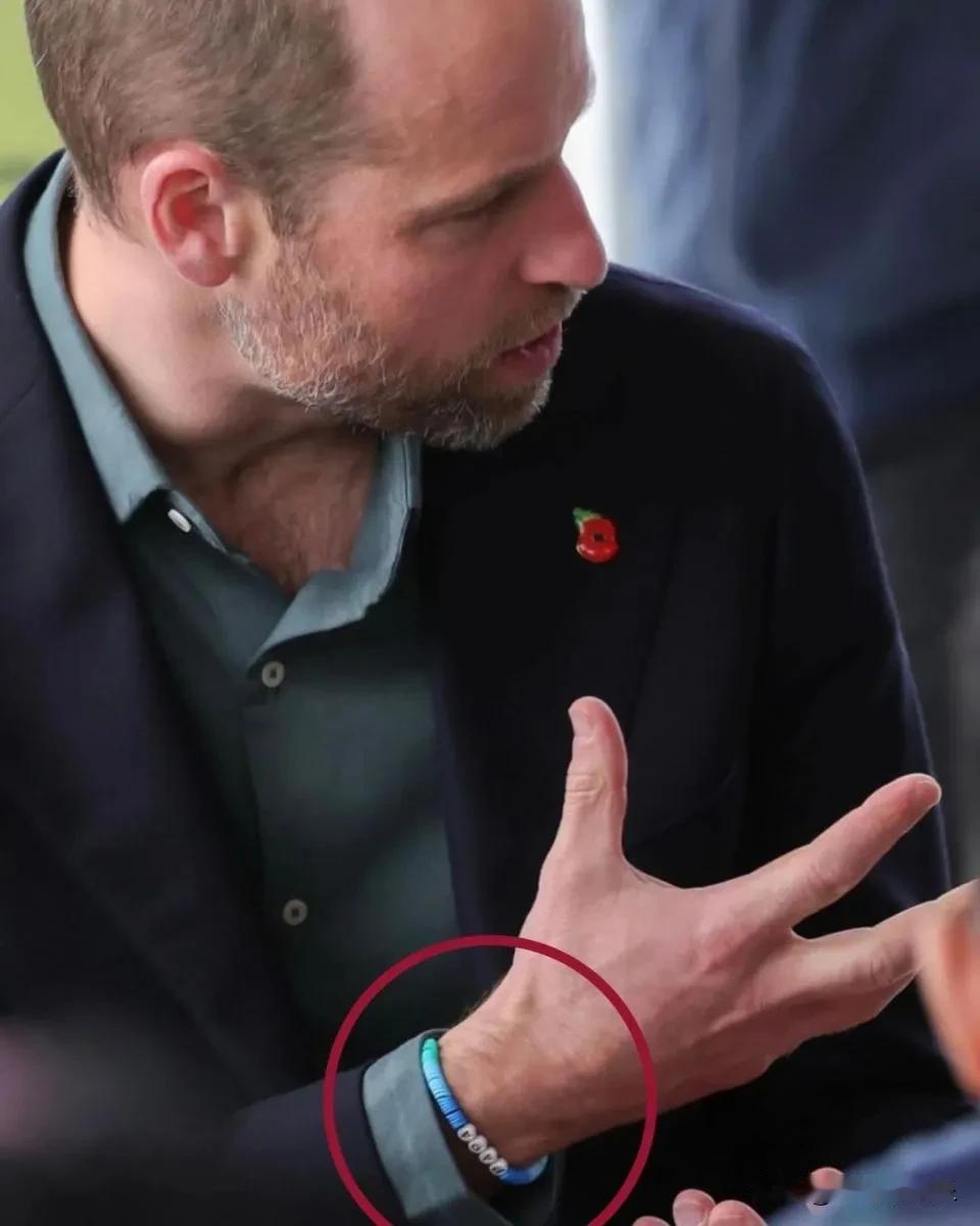 威廉戴着女儿夏洛特做的手绳。 威尔士王子访问南非,他展示了一条印有“Papa”的编织蓝绳手链,并透露这是9岁夏洛特公主亲手做的。