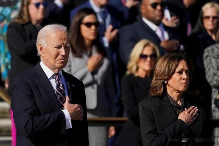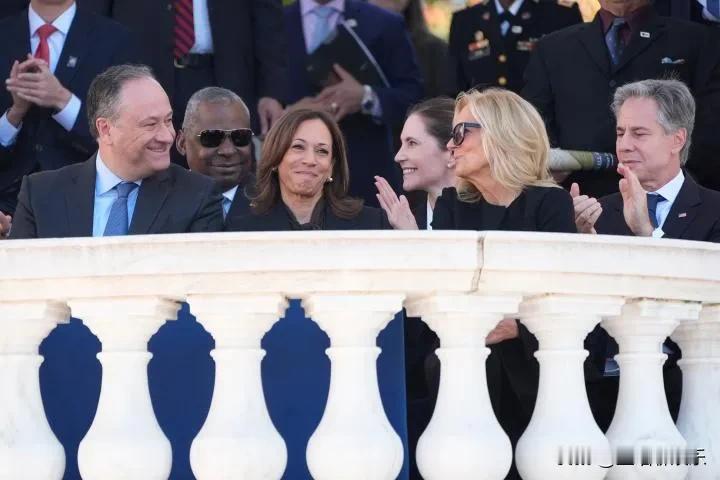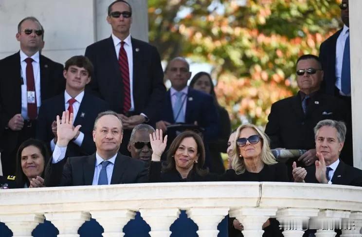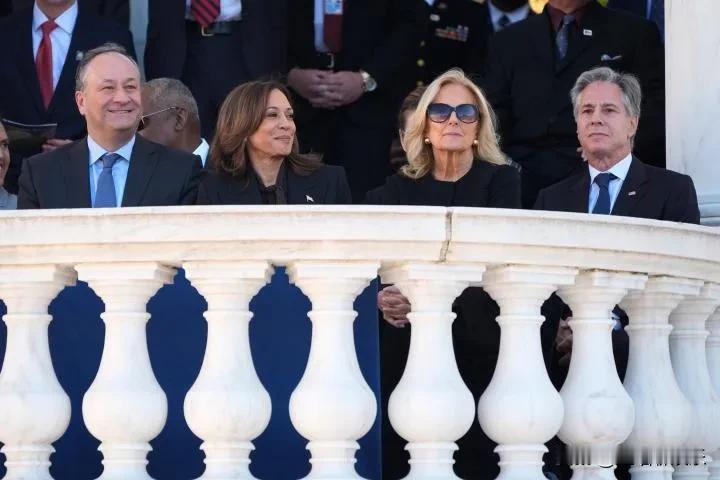 哈里斯败选后首次参加官方活动,她和拜登一同出席了在阿灵顿国家公墓的纪念仪式。 60岁的哈里斯强颜欢笑,她的丈夫道格拉斯暖心安慰。 第一夫人吉尔也在看台观礼,她身着小黑裙搭配珍珠耳环知性又矜贵。