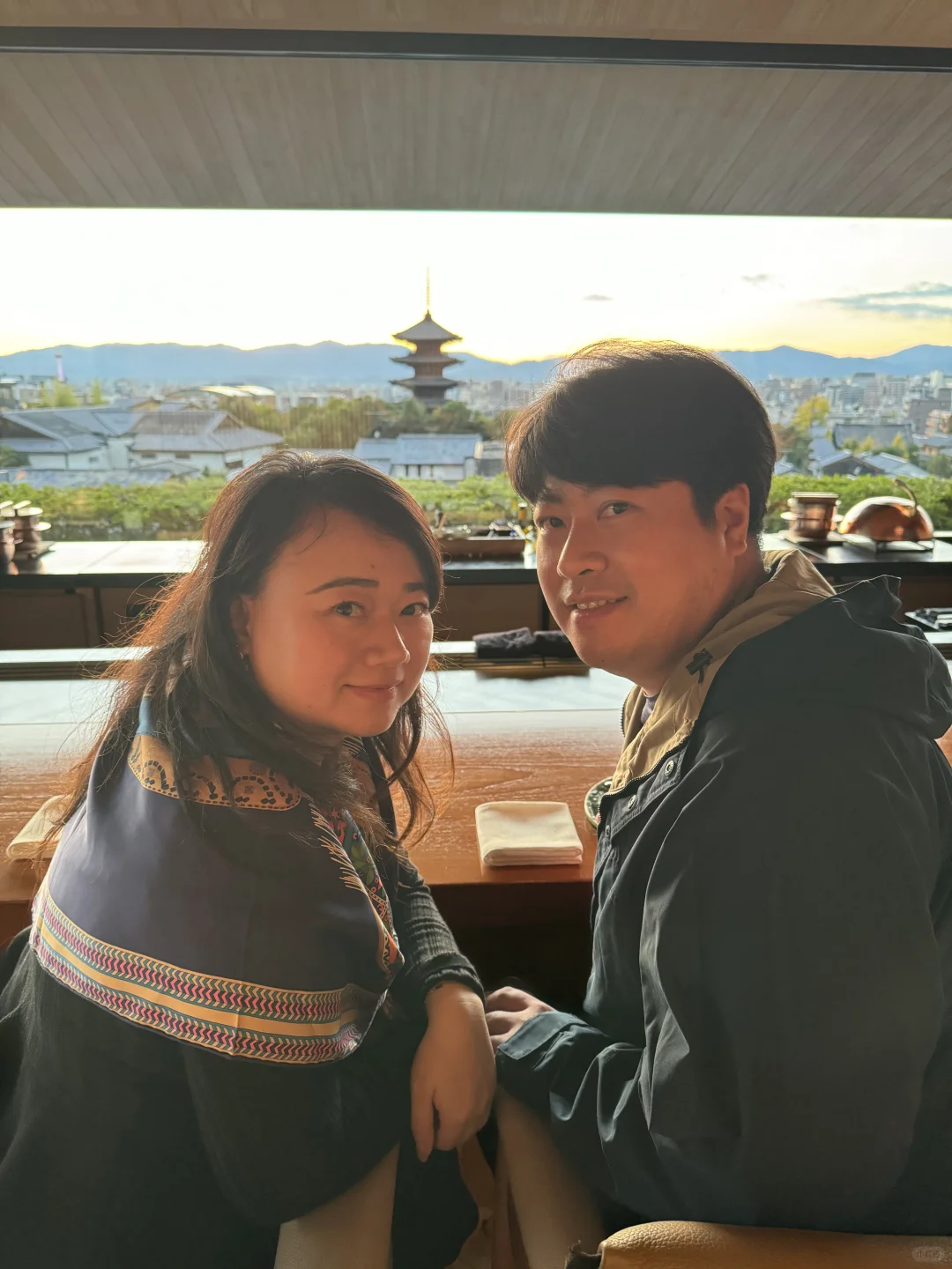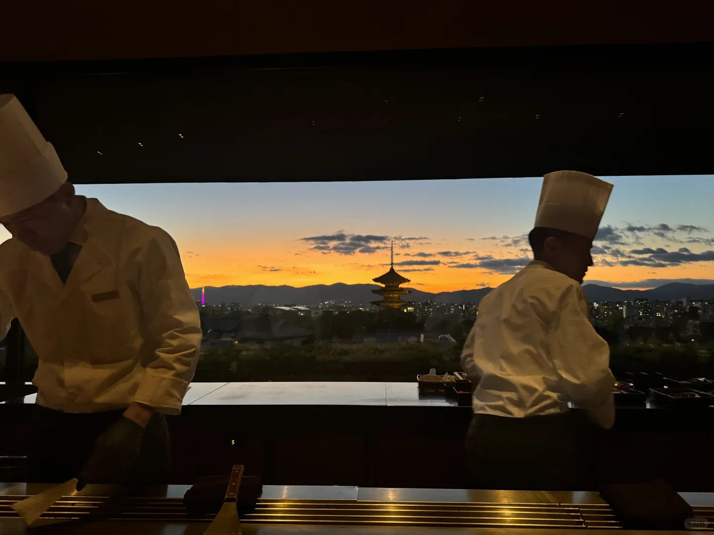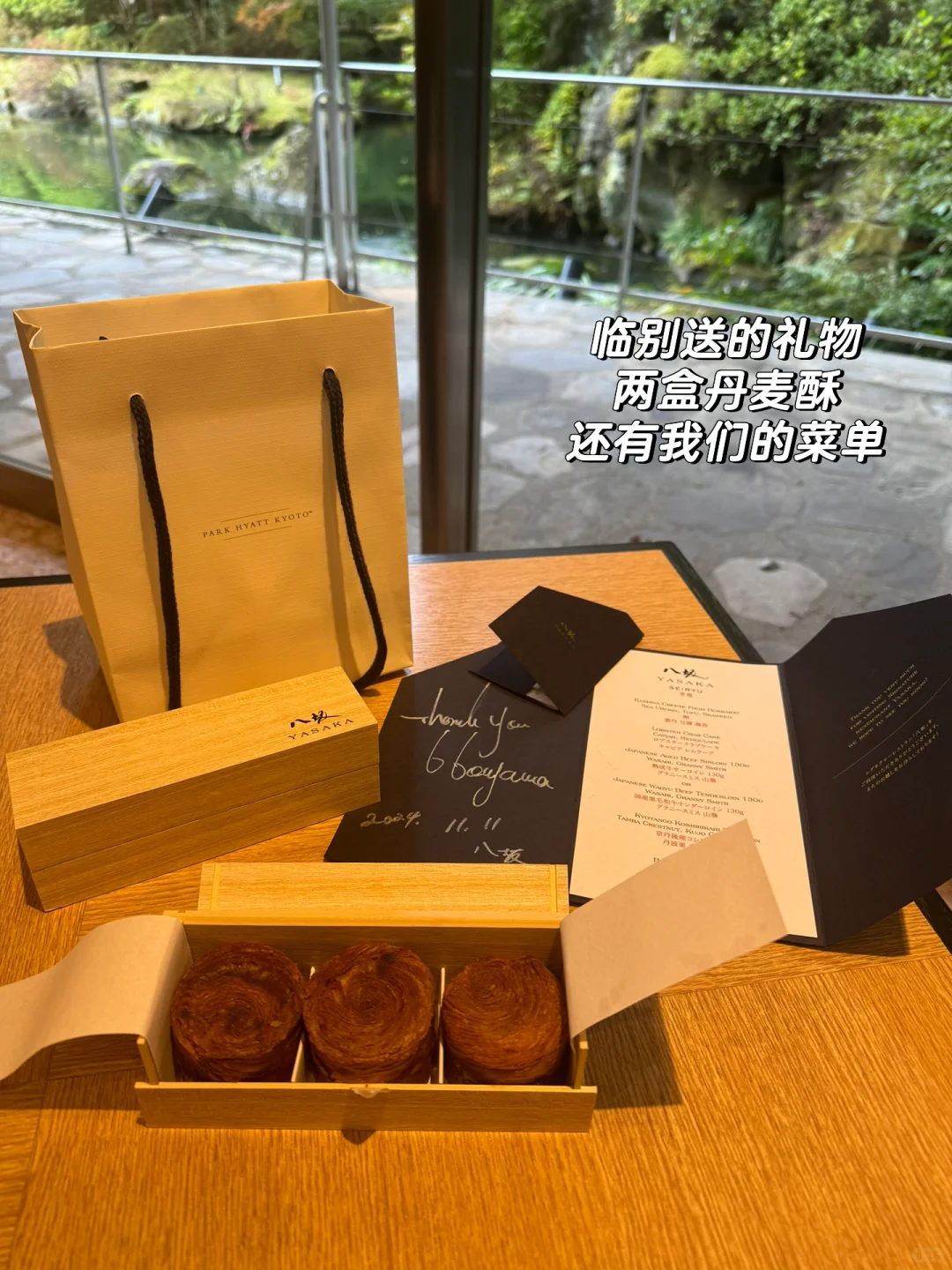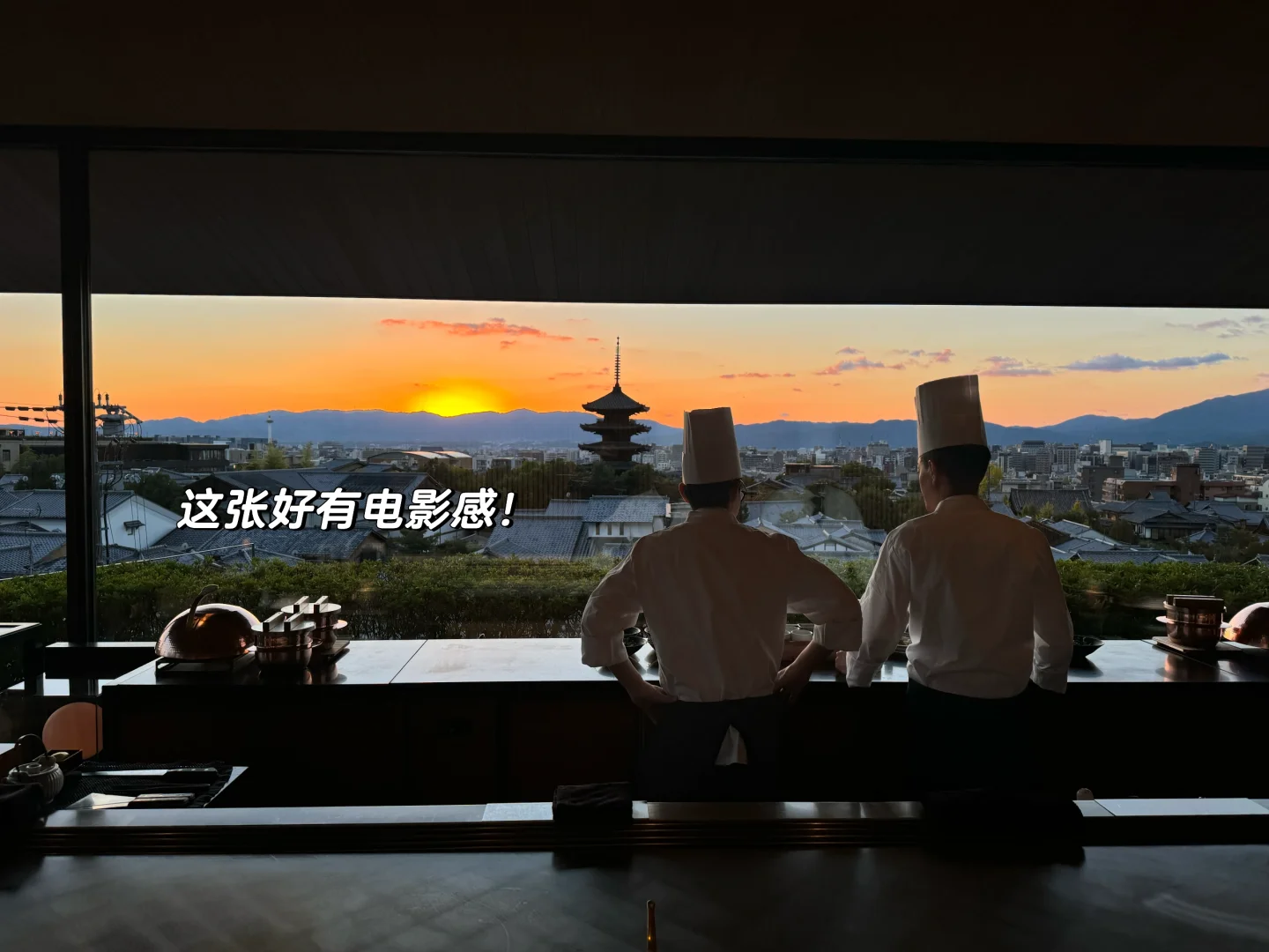 在京都吃的漂亮饭,最推荐是这家在柏悦酒店的铁板烧Yasaka。一边看着日落时的八坂塔,一边吃板前料理,太有幸福感了!提前一个月在官网预订,给了我们最中间的位子!果真是全球最美的柏悦,无论是景观、还是服务都很赞,东西也好吃,牛肉很嫩,新鲜山葵蓉带着苹果和柠檬的香气,甜品也不错。服务员很会提供情绪价值,走的时候是主厨和服务员一起在门口送我们,还给了两盒丹麦酥做礼物,真的是吃得非常开心的一顿漂亮饭!!