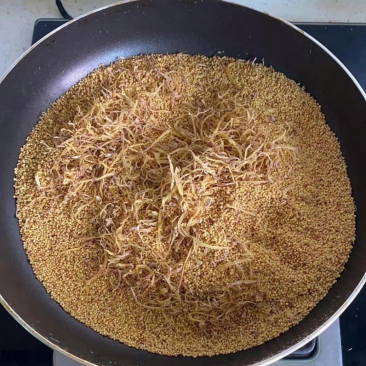 姜丝焙小米,炒至姜丝焦黄,小米酥脆,开水冲泡就可以,健脾养胃,好东西。