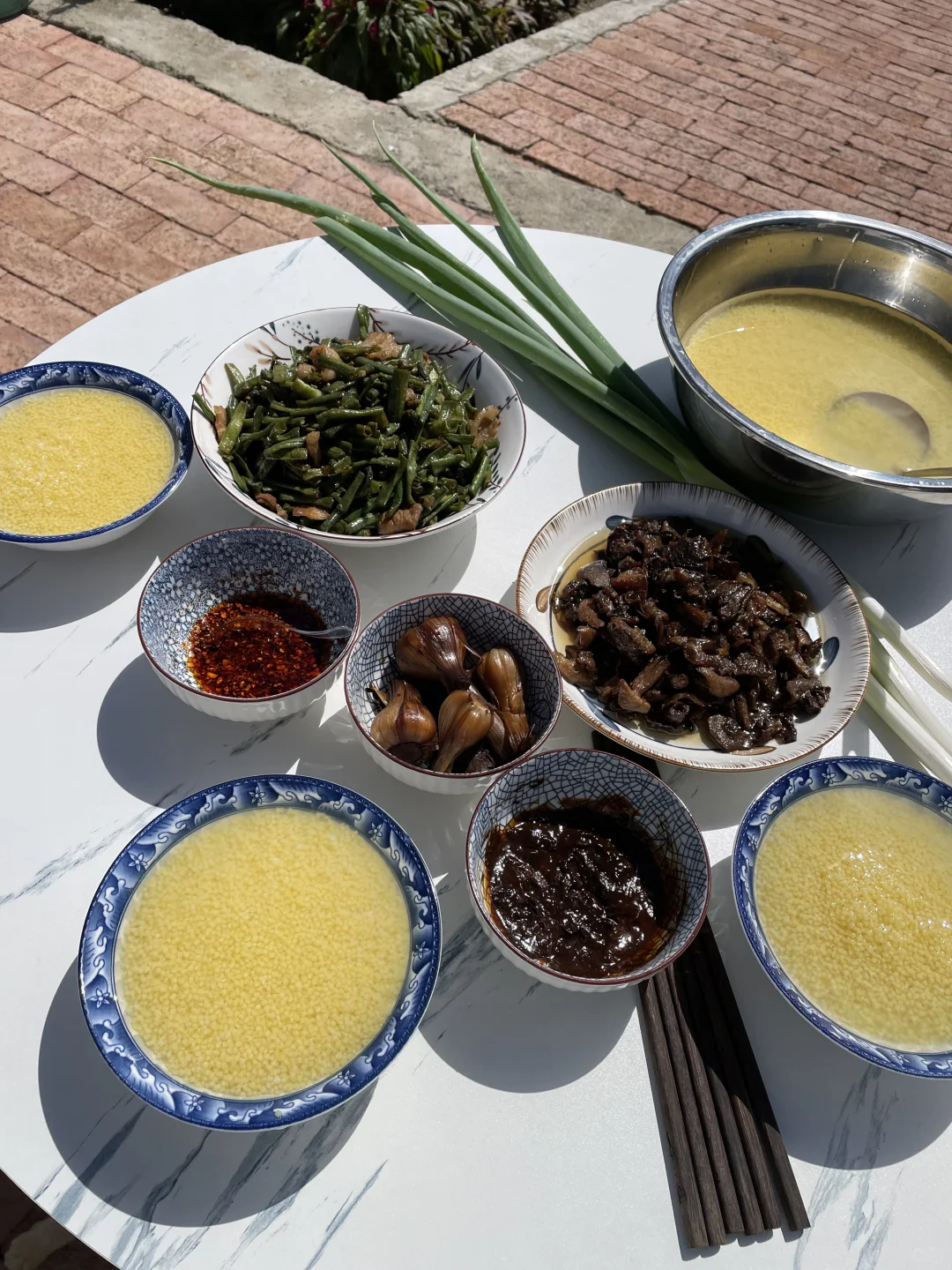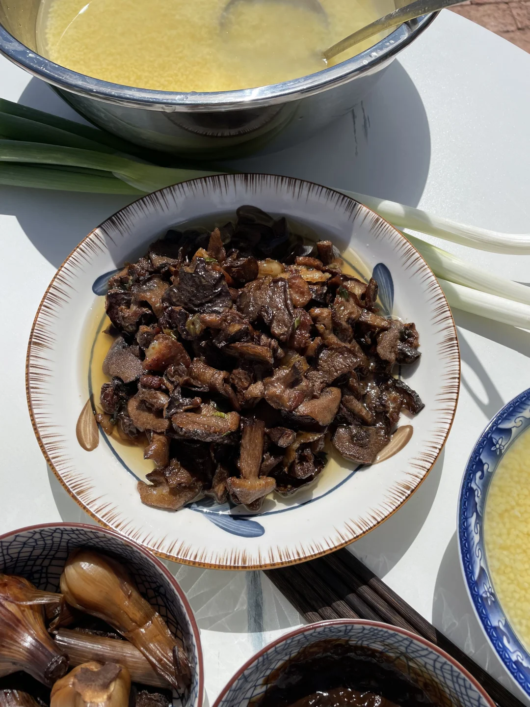 小米水饭 豇豆角 蘑菇炒肉(新采回来滴)