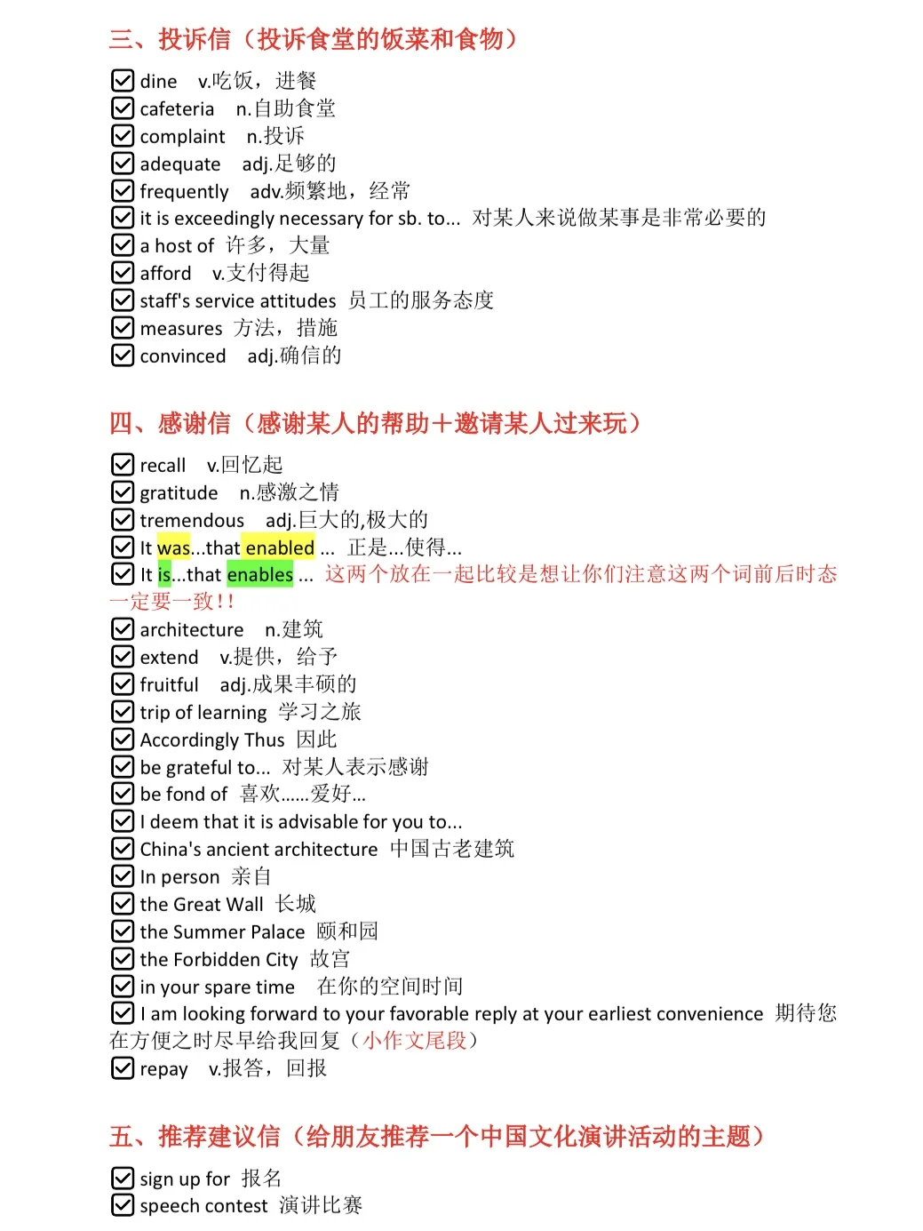 提醒大家❗❗大家一定不要眼高手低,这些单词和短语有些看着很基础,很简单,但真正写的时候你不一定能写对。考场上不追求作文的句子有多高级,但是基本的单词如果拼写错误,老师会觉得你的基础很弱,扣分也会很严重。