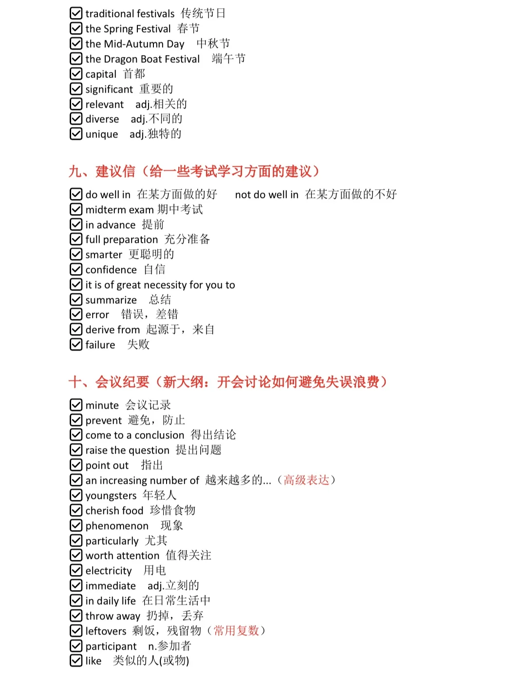 以上主题词大家可以把前面的英语盖住,然后看着汉语默写对应的英语再做修改。不要只是看!!一定一定一定要动笔写一下。