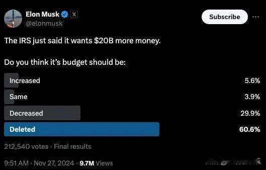 马斯克发帖询问是否应该删除国税局200亿的预算。 据悉,拜登的一名高级官员要求国会向该联邦机构拨款200亿美元后,领导政府效率部的马斯克在X平台做了民意调查,超过60%的人选择“delete删除”国税局的预算。