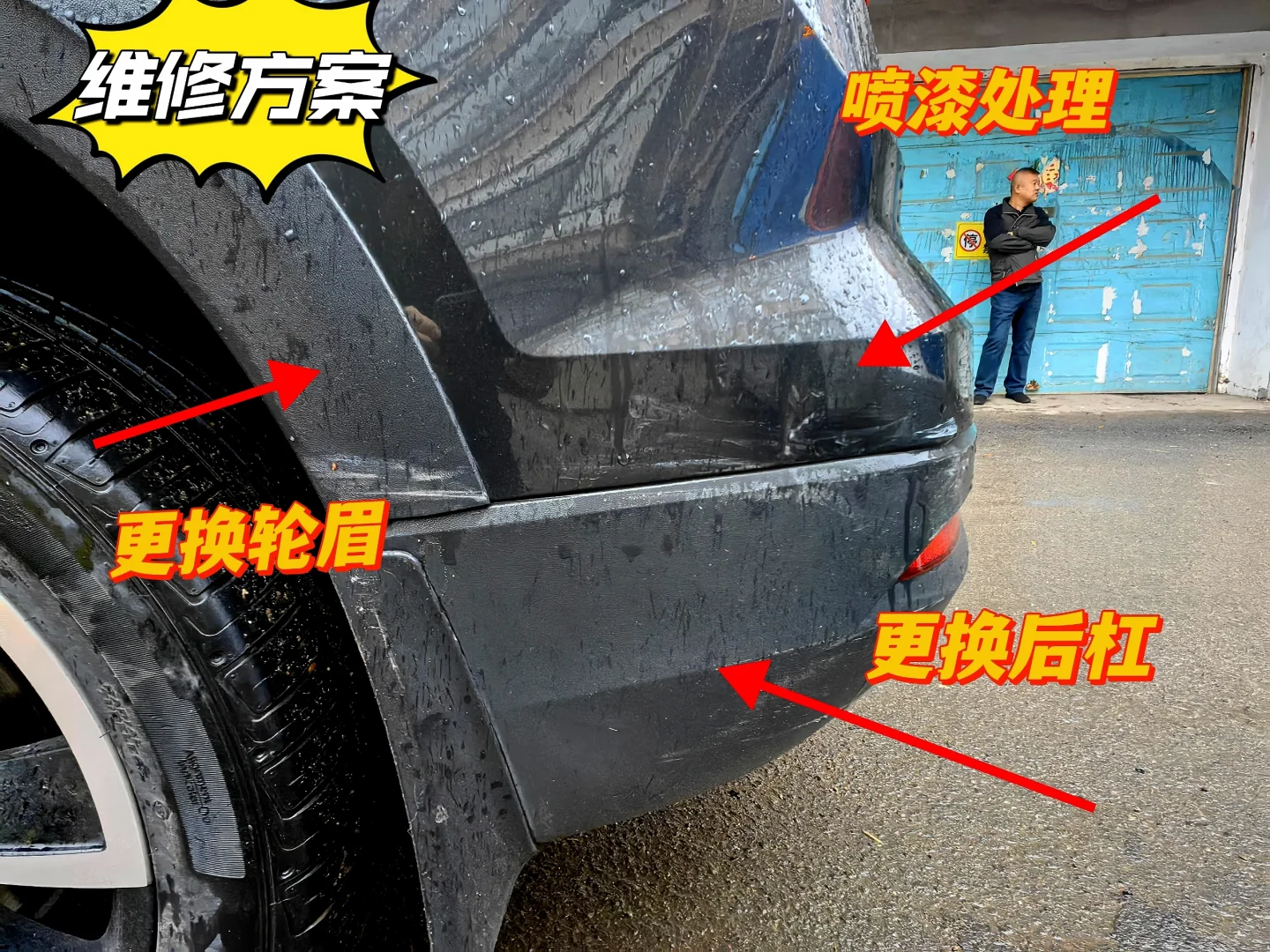 根据4S店的专业评估,此次事故造成的损伤主要集中在后轮眉和后保险杠,两处均需更换新的部件,而后门板则需要重新喷漆处理。而配件需在上海发货,从配件发货到维修完成,整个过程耗时约一周左右。
