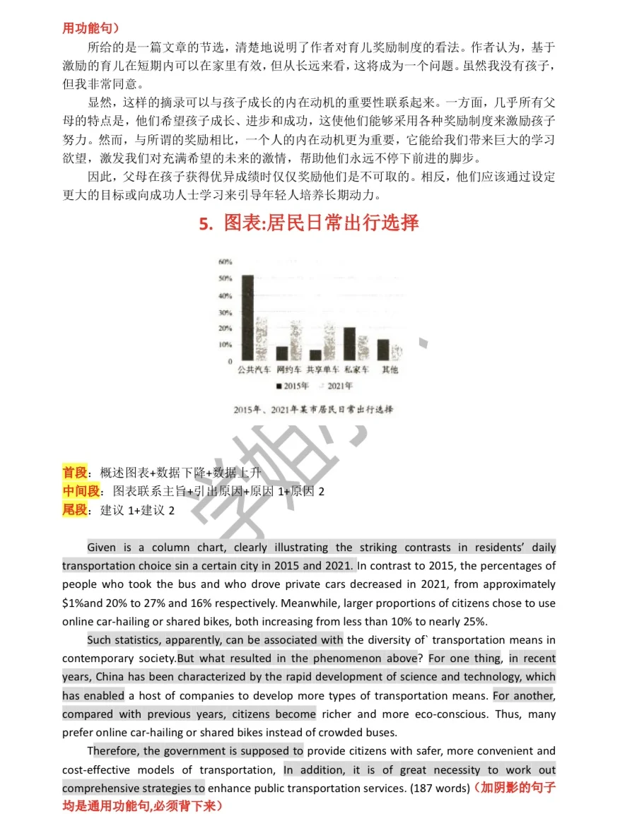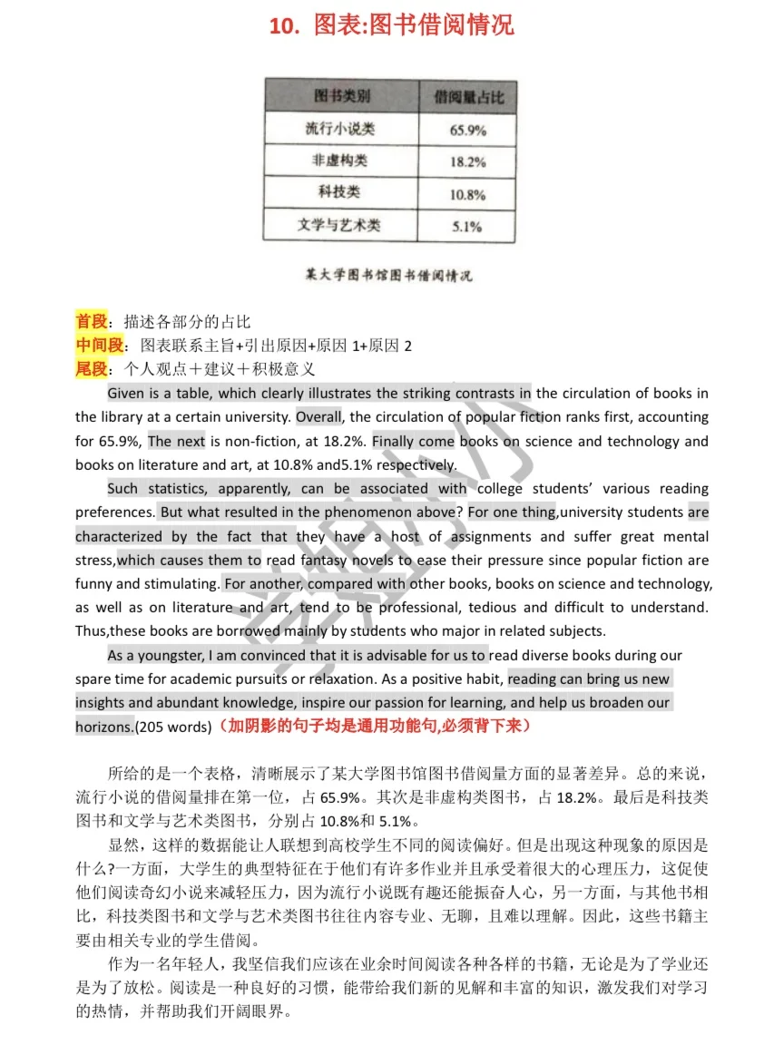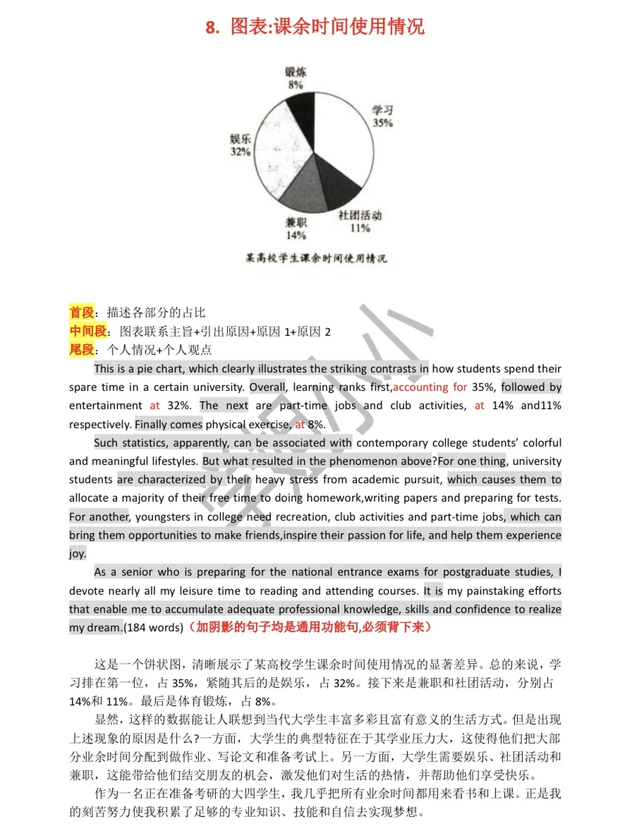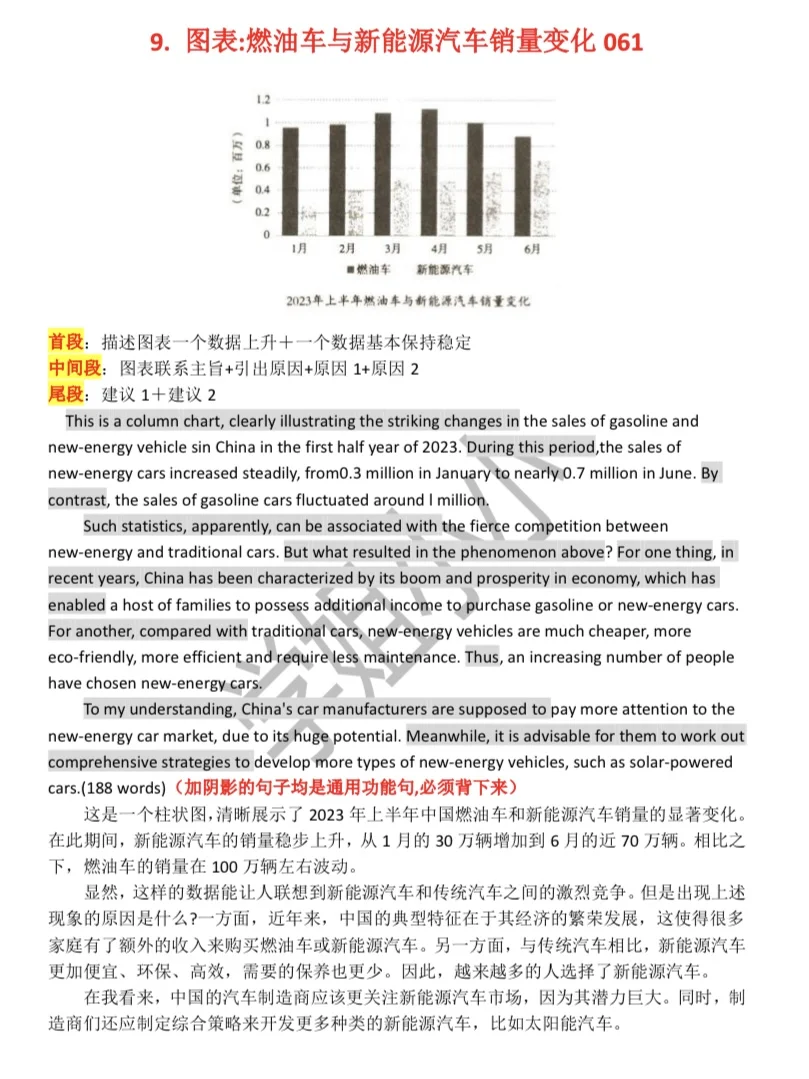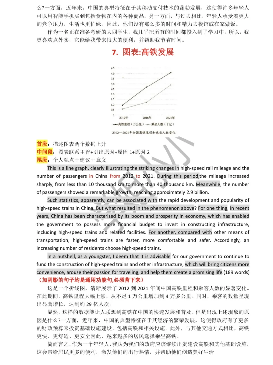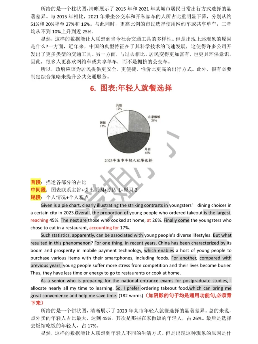 📖对于图表作文已经掌握的差不多的同学就从前到后背,重点掌握下前四篇作文——考纲上有,但还没有考过。后六篇作文是咱们平时反复写的图表作文(分为动态作文——描述变化、静态作文——描述占比),前面按要求默写的,已经对这一类大作文掌握的差不多的同学可以不用默写,过一遍,写写关键词就可以了。