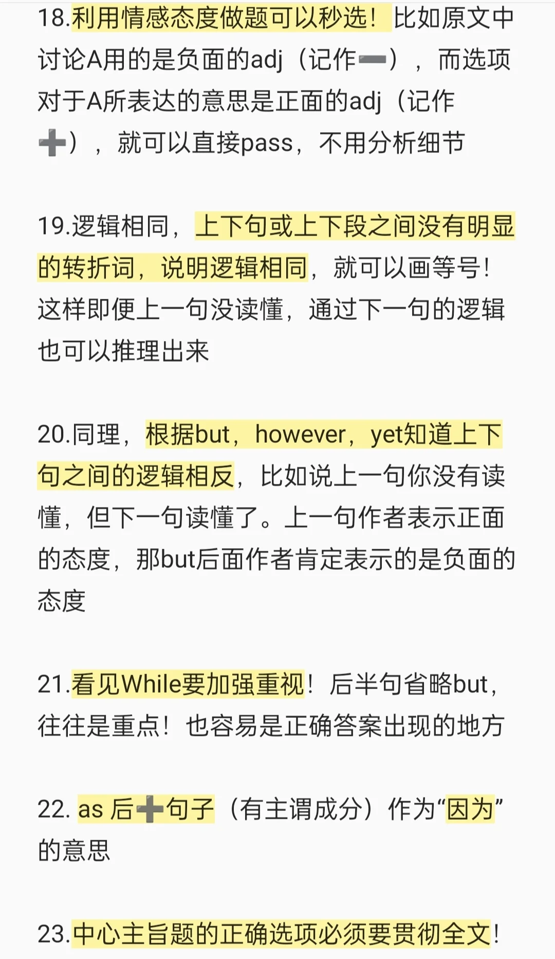 1. 转折之后是重点,但不一定都是题干问的内容!!大家对于转折之后是重点已经牢记于心了,甚至做题的时候会条件反射直接看到转折之后,但这个前提是题干没有明确定位点的情况下!题干有定位点,就只看定位点的句子,即便后面紧跟but也不要看,这样选出来就和正确答案完全相反了。