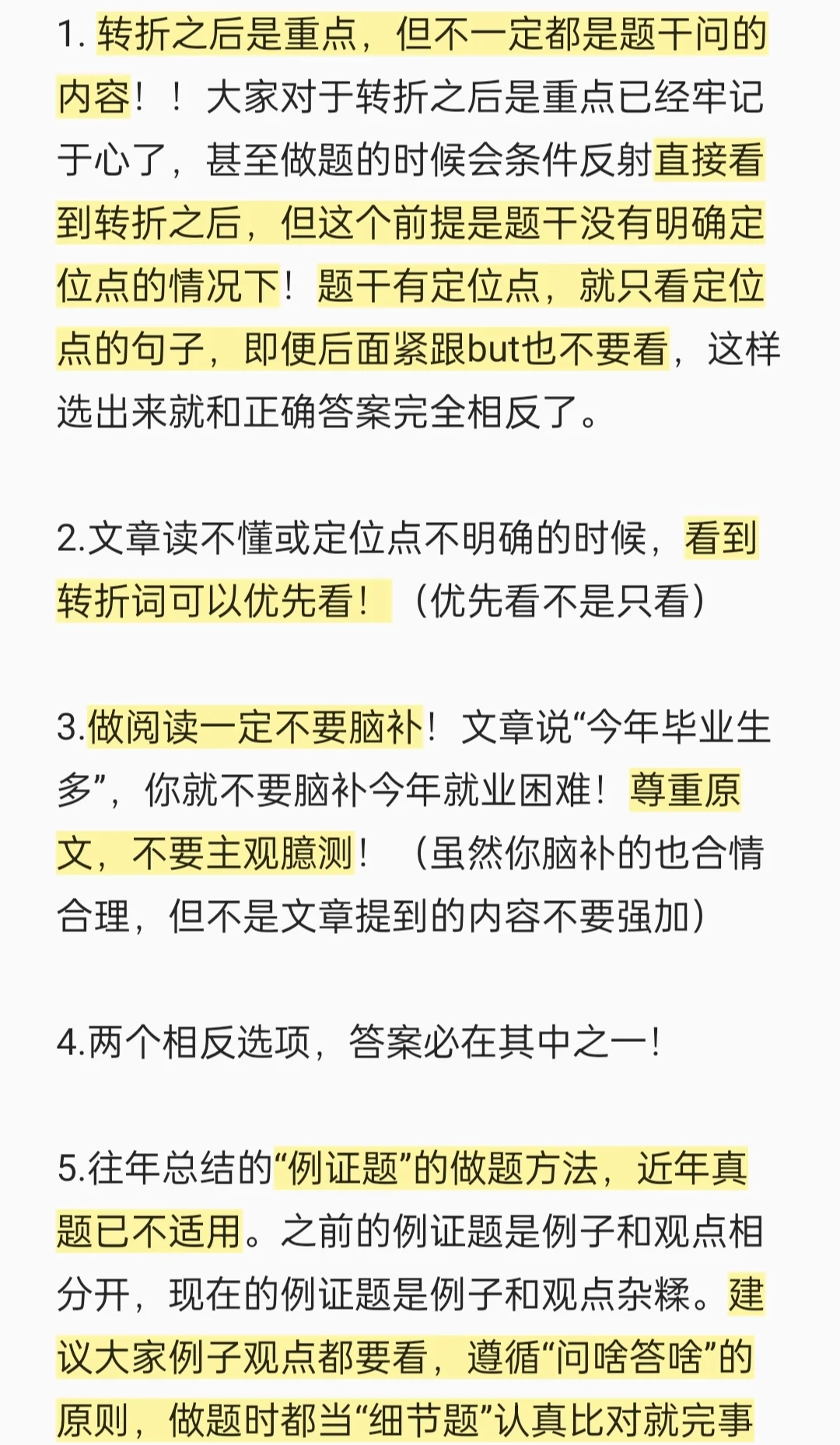 5.往年总结的“例证题”的做题方法,近年真题已不适用。之前的例证题是例子和观点相分开,现在的例证题是例子和观点杂糅。建议大家例子观点都要看,遵循“问啥答啥”的原则,做题时都当“细节题”认真比对就完事了!