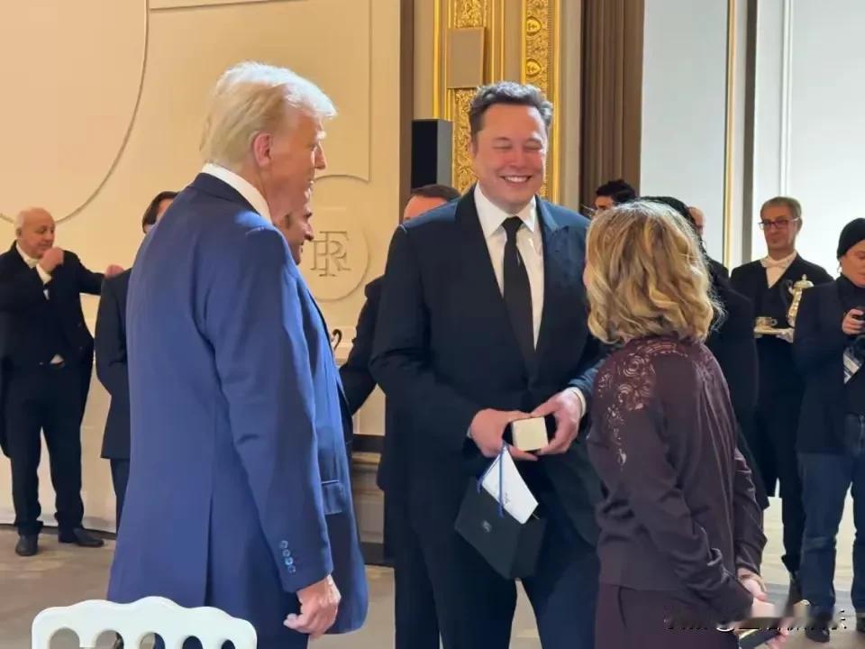 马斯克带礼物给梅洛尼,特朗普和马克龙在旁边看着。 梅洛尼一脸害羞,马斯克眼神拉丝好开心。