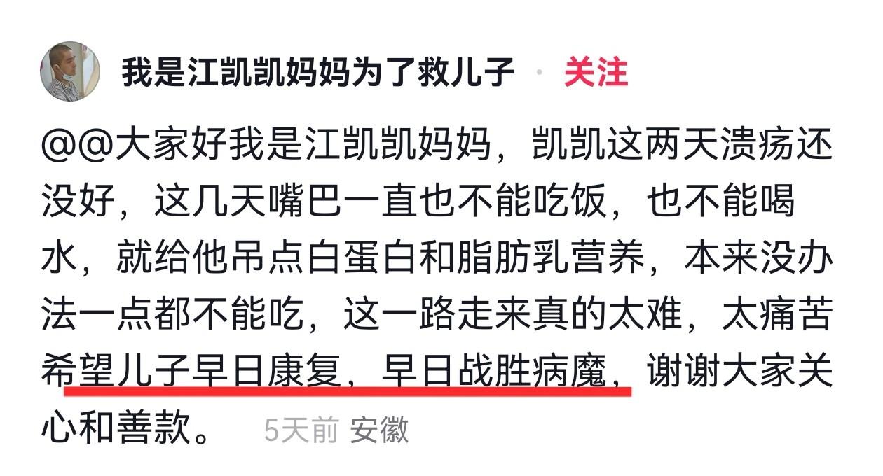 媒体和网友之所以关注这件事,是因为江凯凯在2025年4月份被查出急性淋巴细胞白血病后,其母亲为了儿子的救治到处筹钱,包括开直播、拍视频,这对于一个生在农村的老母亲来说,无疑是拼尽了全力。