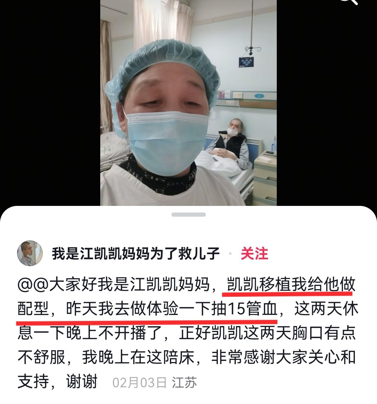 后来为了给儿子安排更好的治疗,接受了网友的建议,去了苏州某医院,经过一系列的化疗,江凯凯的母亲决定要自己给儿子做配型移植,并进行了体检,抽了15管血,身体一度非常不适,晚上的直播都停了。