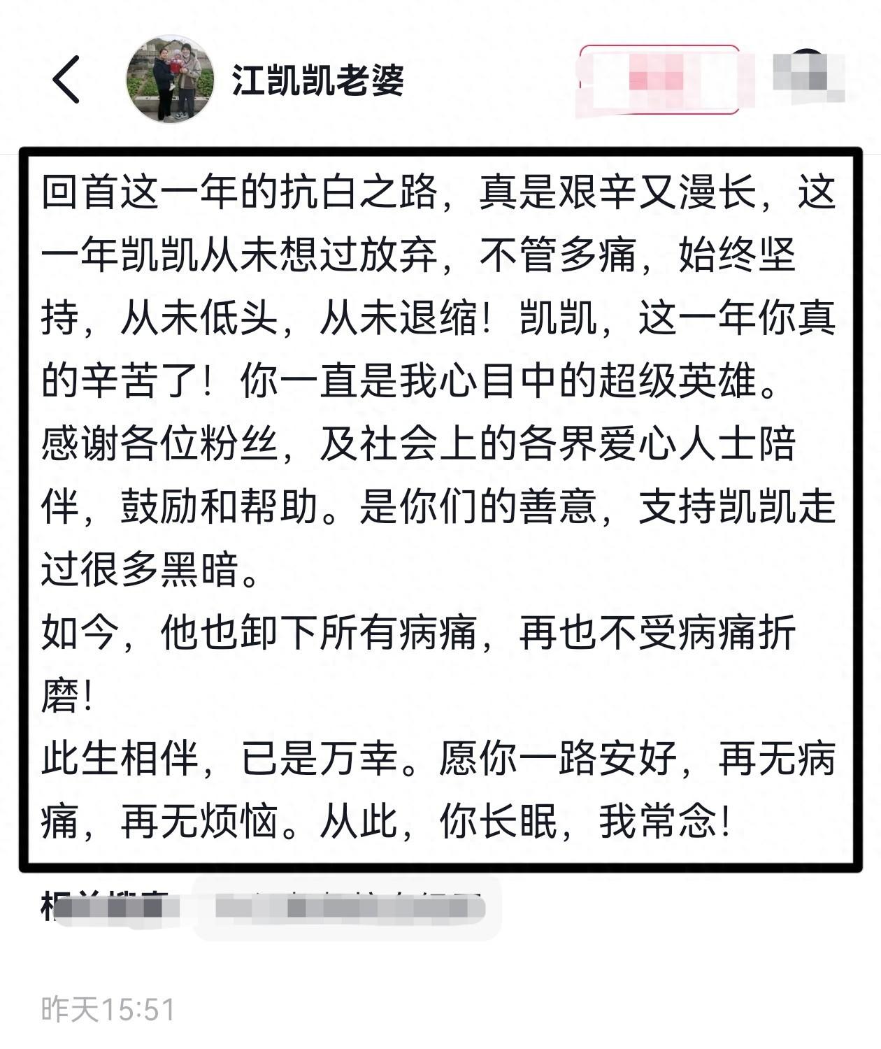 4月2日,安徽抗癌博主江凯凯的妻子在社交媒体发文,称丈夫一路走来非常辛苦,从未想过放弃,也未曾低头和退缩,但还是没能扛过去。
