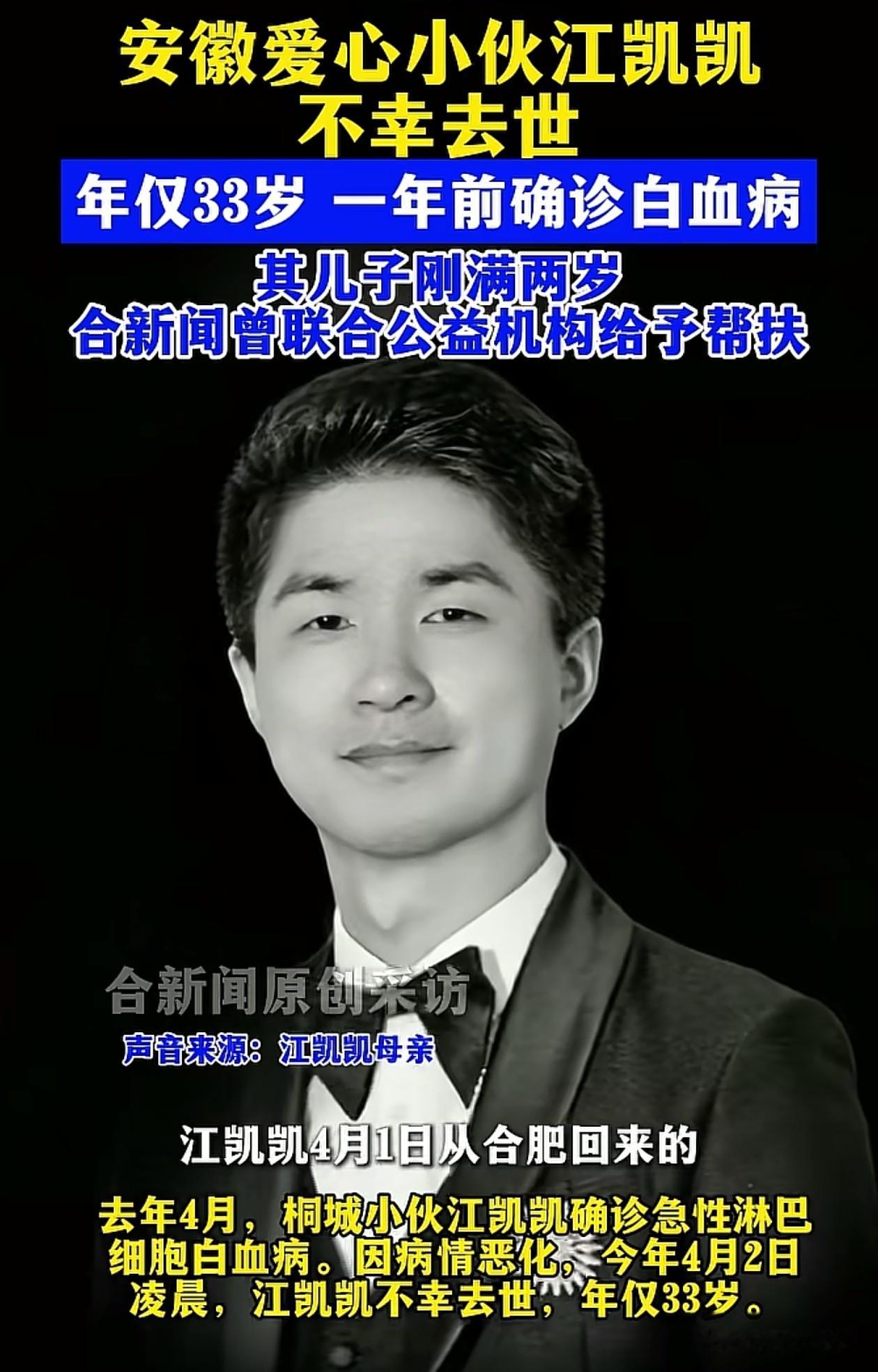 目前,江凯凯去世的消息已经被媒体证实,其母亲表示,他们4月1日才从合肥的医院回家,没想到儿子这么快就离开了,留下了一个2岁的孩子。