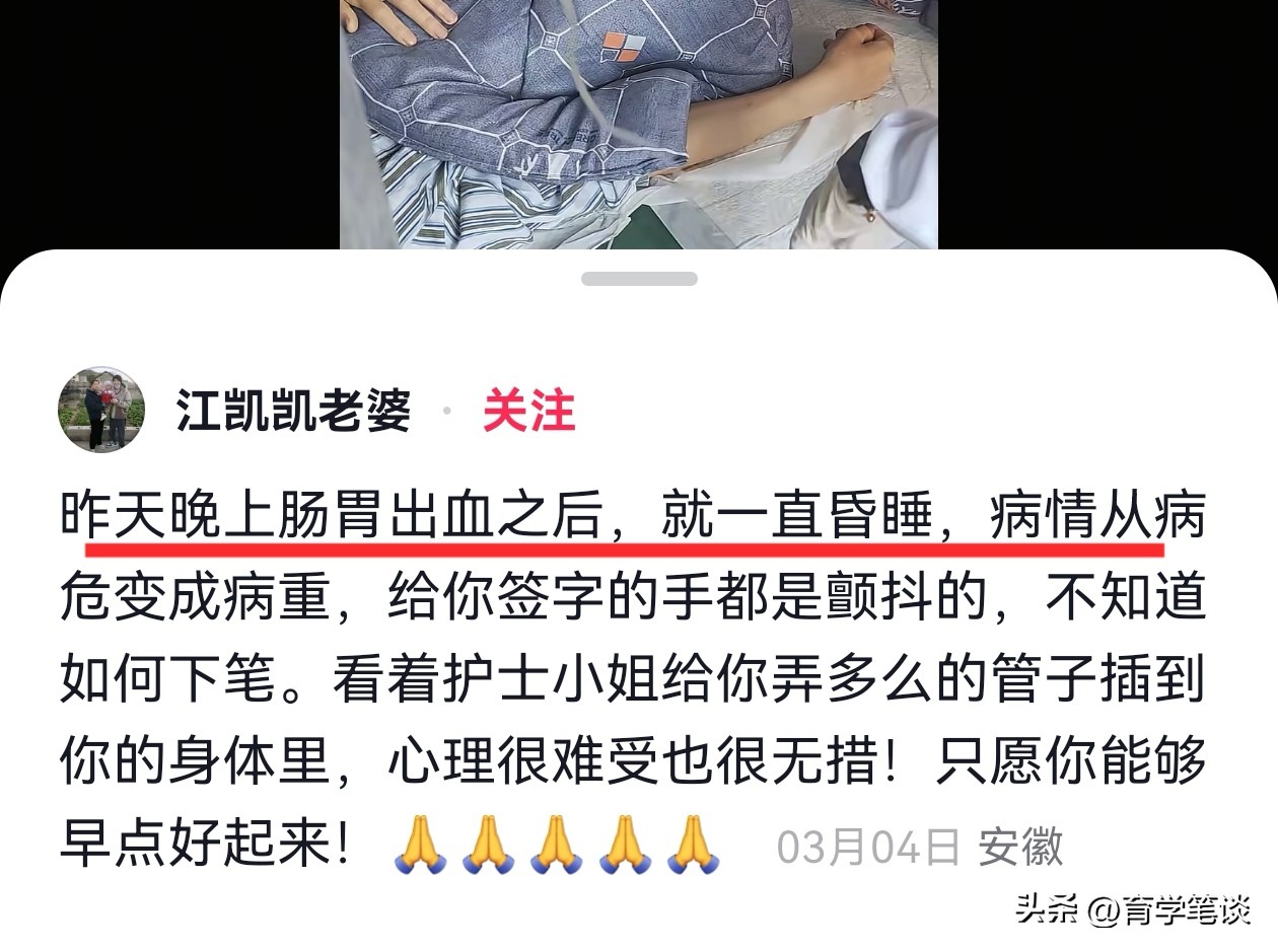 在3月初的时候,江凯凯的妻子曾发视频透露,丈夫已经有胃出血症状,人也一直在昏睡,情况非常严重,医生已经让她签病危通知书了。