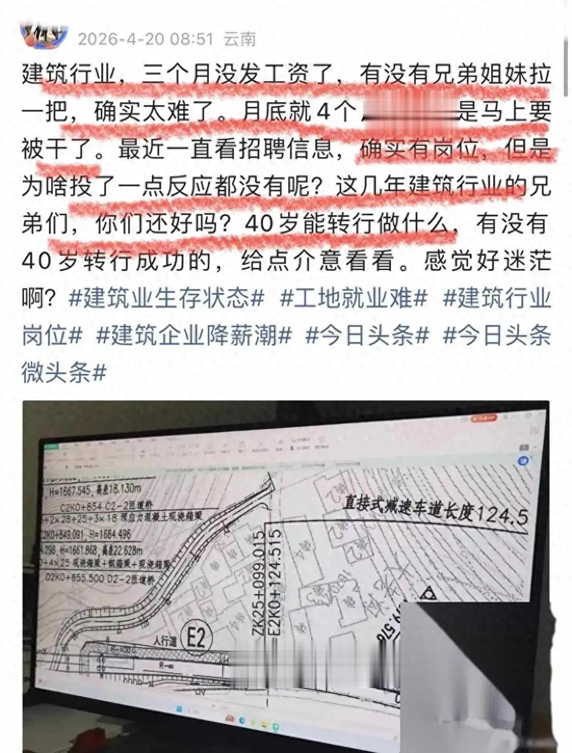 时间是2026年4月中旬。发帖人叫老张,干了半辈子工程,被欠薪四个月,眼瞅着公司快散伙了。他海投了二十多份简历,一个回音都没有。