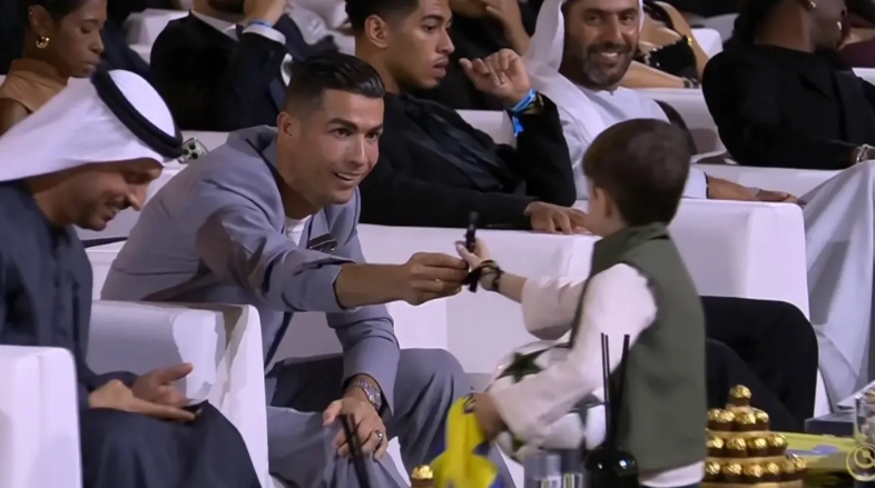 环足奖的颁奖典礼现场,有一位C罗的小球迷偷着找C罗去要签名,后面还有保安追[允悲], C罗还非常有爱心的满足了小球迷的愿望,还没忘记把笔还给他[比耶]。