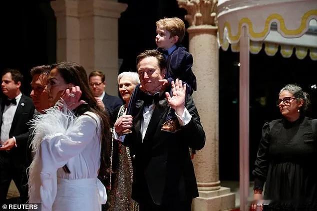 马斯克携4个孩子、妈妈梅耶参加特朗普的跨年派对。他扛着X娃,当选总统特朗普站在旁