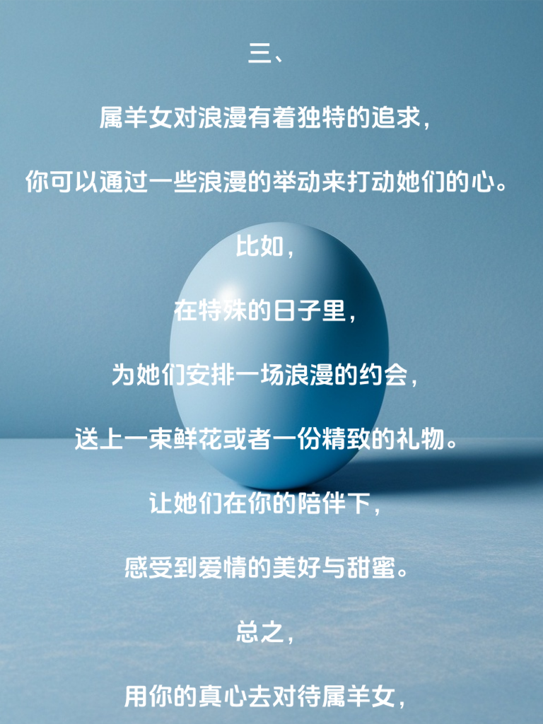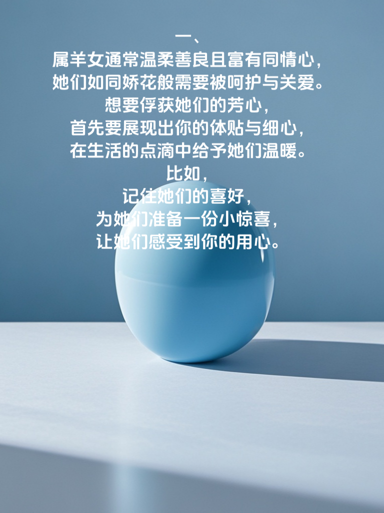 一、属羊女通常温柔善良且富有同情心,她们如同娇花般需要被呵护与关爱。想要俘获她们的芳心,首先要展现出你的体贴与细心,在生活的点滴中给予她们温暖。比如,记住她们的喜好,为她们准备一份小惊喜,让她们感受到你的用心。 二、与属羊女相处时,要保持真诚与耐心。不要用虚假的面具去迎合她们,而是要展现真实的自己。当她们遇到困难时,默默地陪伴在她们身边,给予她们力量和支持。同时,要有耐心去倾听她们的心声,让她们感受到你对她们的尊重。 三、属羊女对浪漫有着独特的追求,你可以通过一些浪漫的举动来打动她们的心。比如,在特殊的日子里,为她们安排一场浪漫的约会,送上一束鲜花或者一份精致的礼物。让她们在你的陪伴下,感受到爱情的美好与甜蜜。总之,用你的真心去对待属羊女,用你的行动去证明你的爱,就一定能够俘获她们的芳心。
