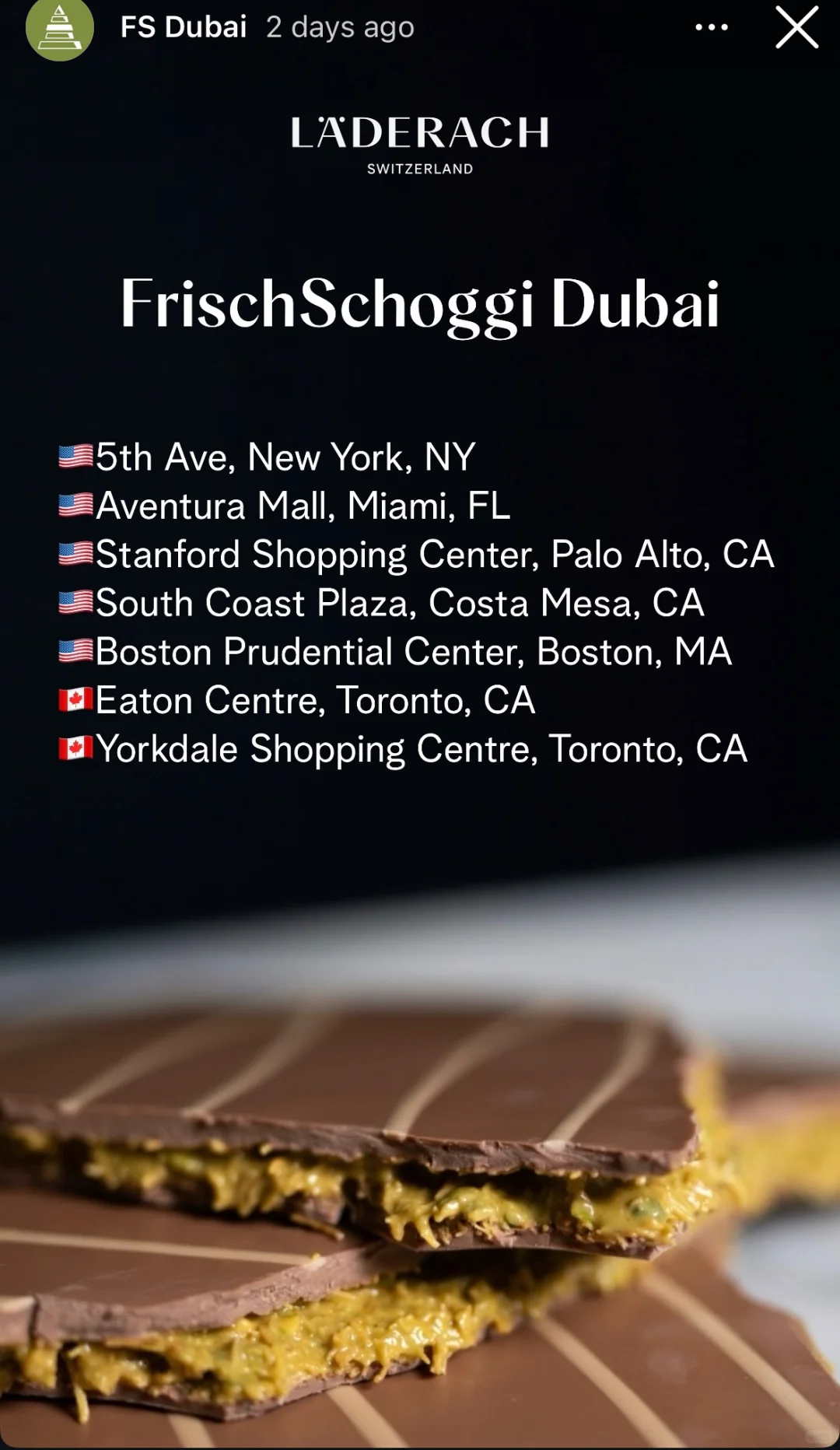PA果然是宇宙中心!打败了VF&SF 全球200家店铺中,仅有23家发售这款限量版迪拜巧克力 — 🍫 迪拜巧克力 相比之前吃过的Nuts Factory,这款的夹心更薄 整体口感更加清爽酥脆,但依旧偏甜 据PA的sales介绍,是限量款,卖完店内现货就没有了 北美还可以购买到的门店在图5(分别位于纽约/波士顿/尔湾/迈阿密/多伦多) · 在这里强烈安利他们家的黑巧榛子🌰 每次去逛街可以不买衣服可以不买彩妆 但一定会买点Läderach 贵不是它的错, 是我的😭 · In a nutshell👉 冲着限定, 可买一下 — 📌 Laderach - Stanford Shopping Center 📍301 Stanford Shopping Center, Palo Alto 🕙 10 am - 7 pm (⚠️只有PA才有, Valley Fair那家没有) —