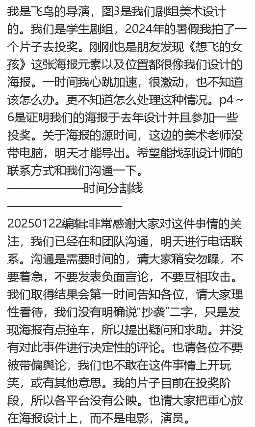 这个网友设计的《飞鸟》海报和《想飞的女孩》海报在创意和构图上相似程度很高,这真的很让人怀疑呢🧐。不过这个网友真的很理智呀,他没有像很多人那样直接就开骂抄袭,而是积极地去和《想飞的女孩》的团队沟通🤝。这种做法在娱乐圈里真的是一股清流呢👏。