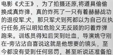 据说当时狗知道是真炸弹,军犬经过训练都能闻出来,但是训导员不知道。 狗在最后流着泪回头看了一眼,训导员以为狗入戏了,后来明白他是在告别[微笑] 那部电影,我至今难忘。 炸弹爆炸的瞬间,那只狗被抛向空中,没有丝毫特效,真实的令人窒息。 我当时就觉得它肯定活不下来了,那种冲击力,根本不可能幸存。 心里难受了好几天。 想起《教父》里那匹血淋淋的马,也是真的马。 那个年代,对动物的保护意识远不如现在。 为了拍摄效果,不惜一切代价,甚至牺牲动物的生命。 我小时候也做过一些傻事。
